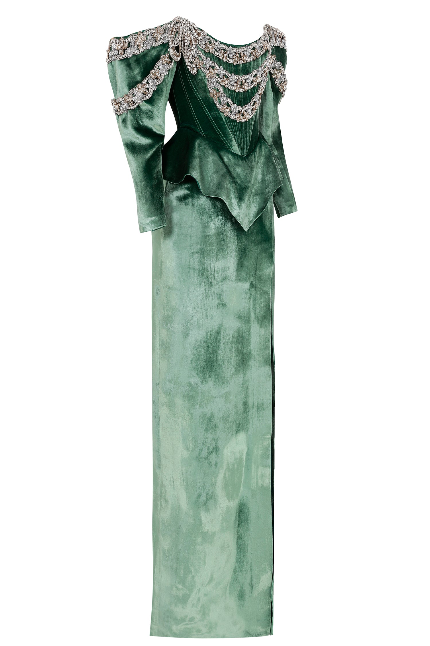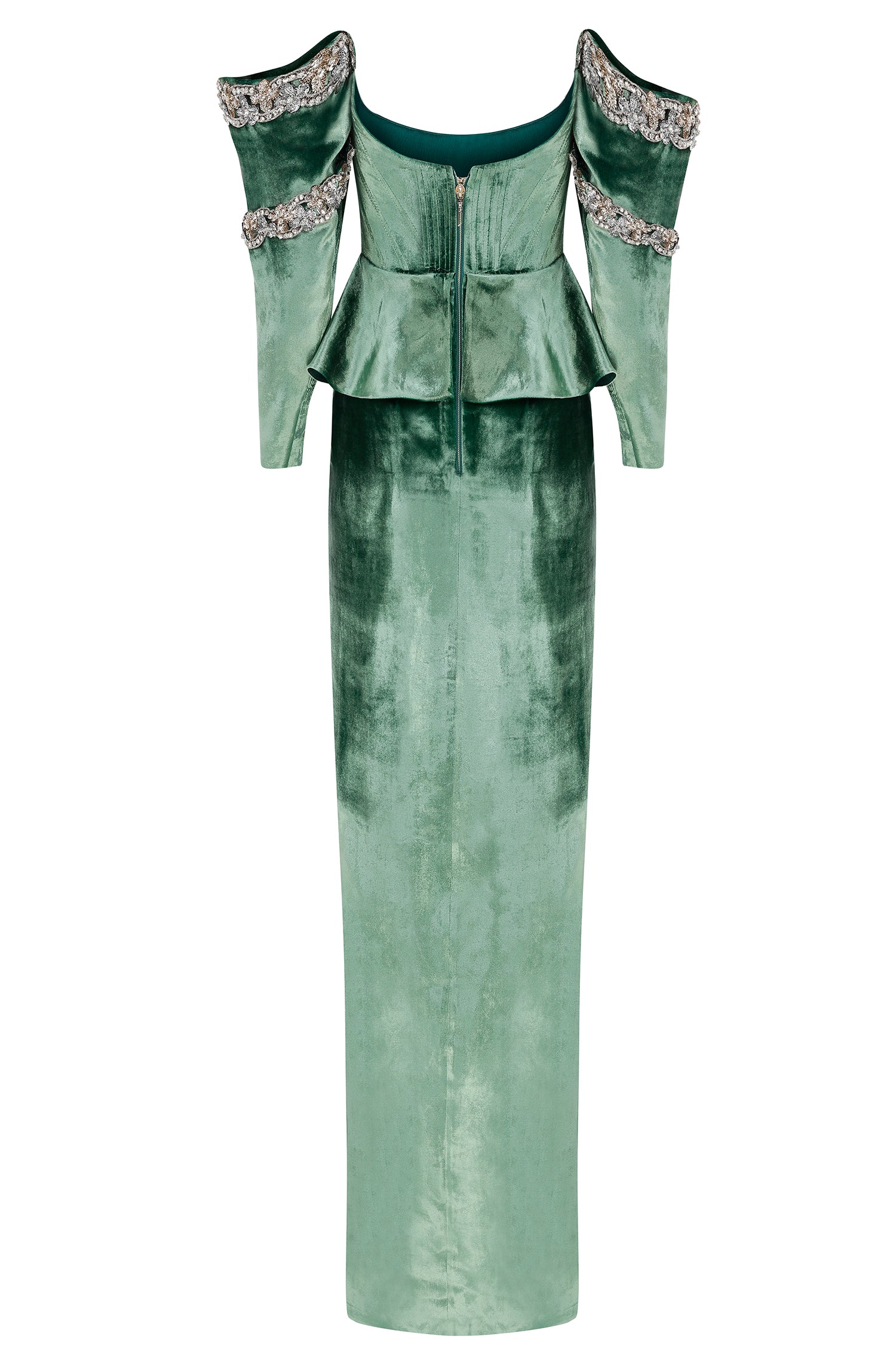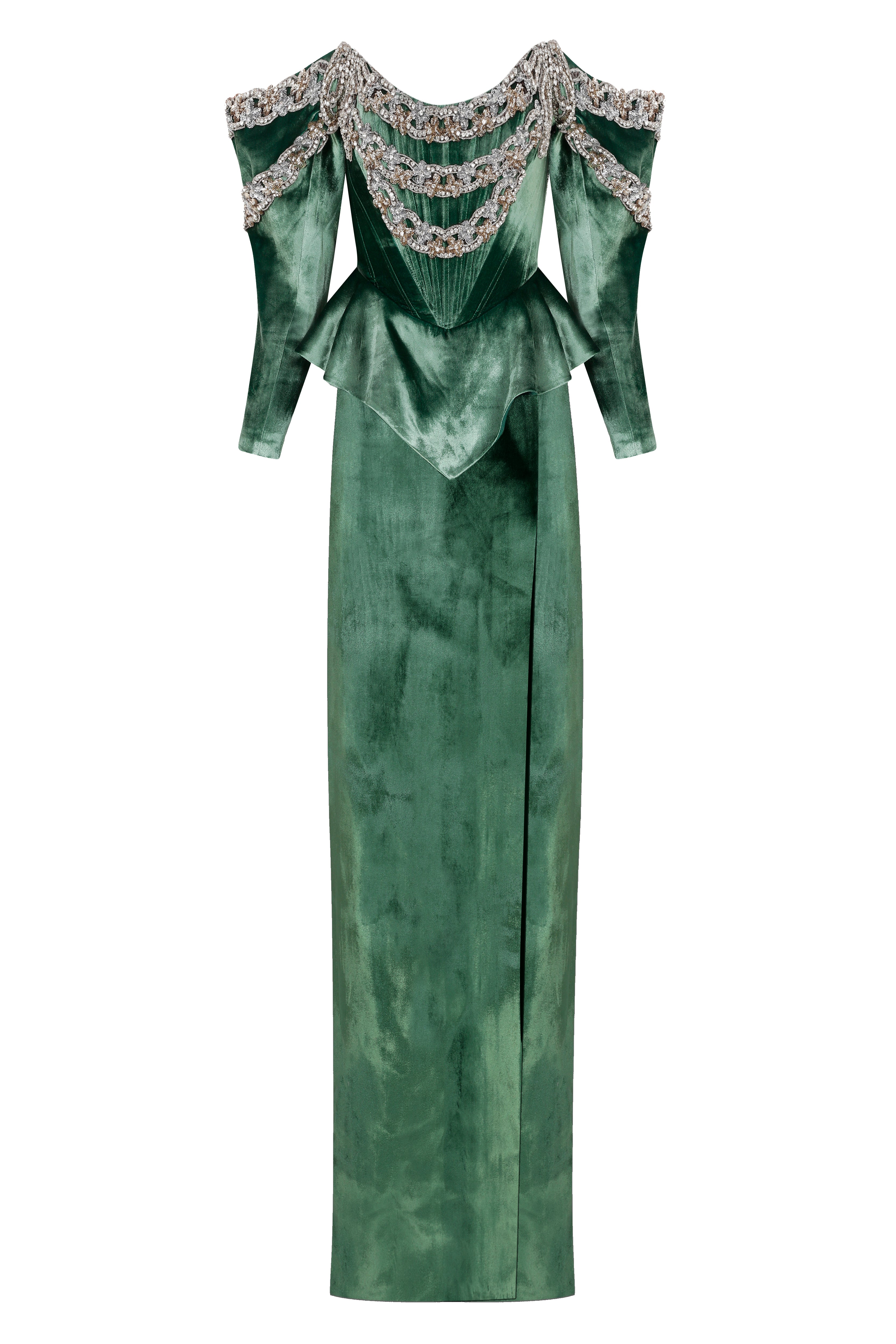This dress, with a corset waist, has off- shouldered decorated with embroidered details.