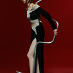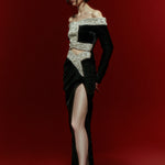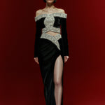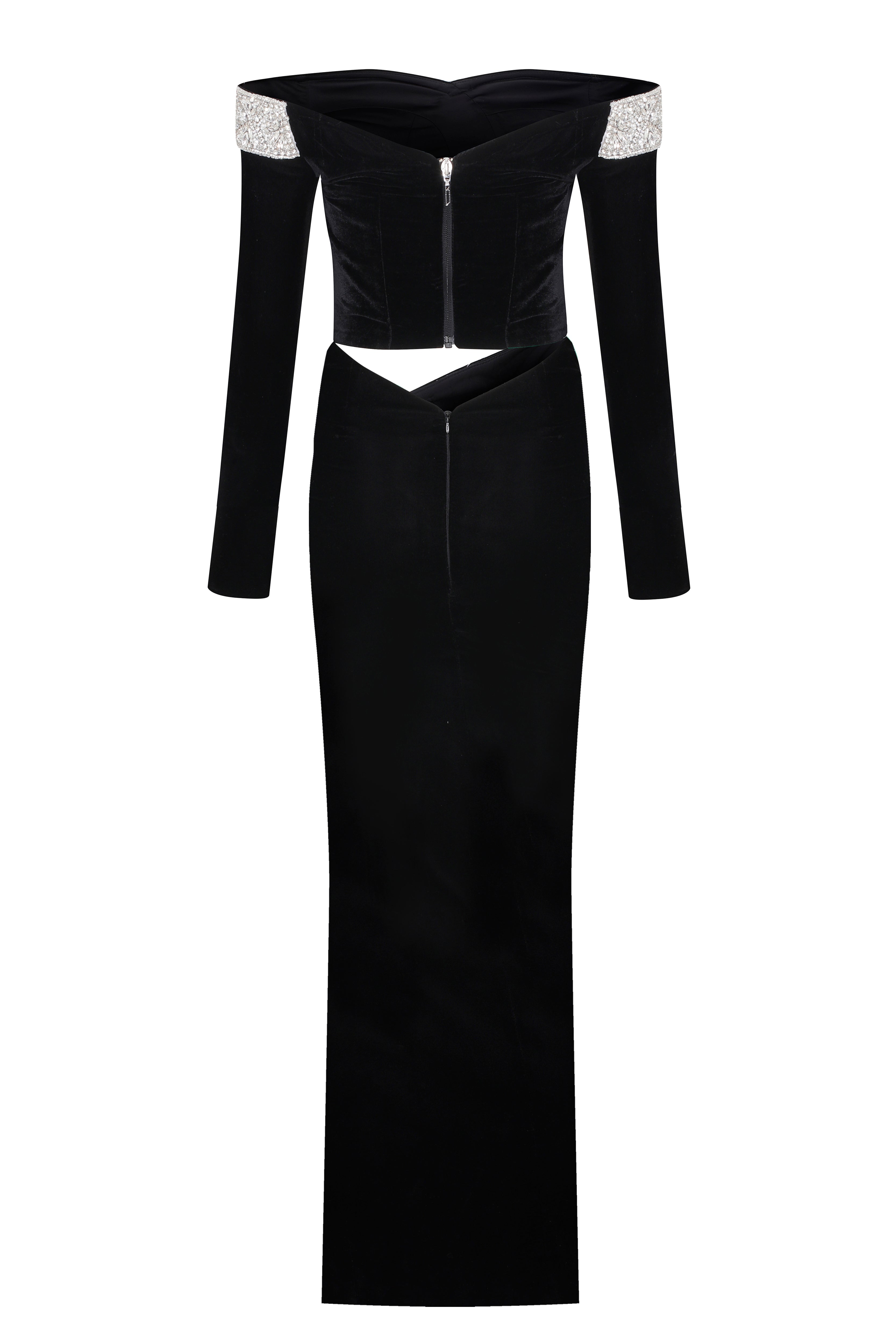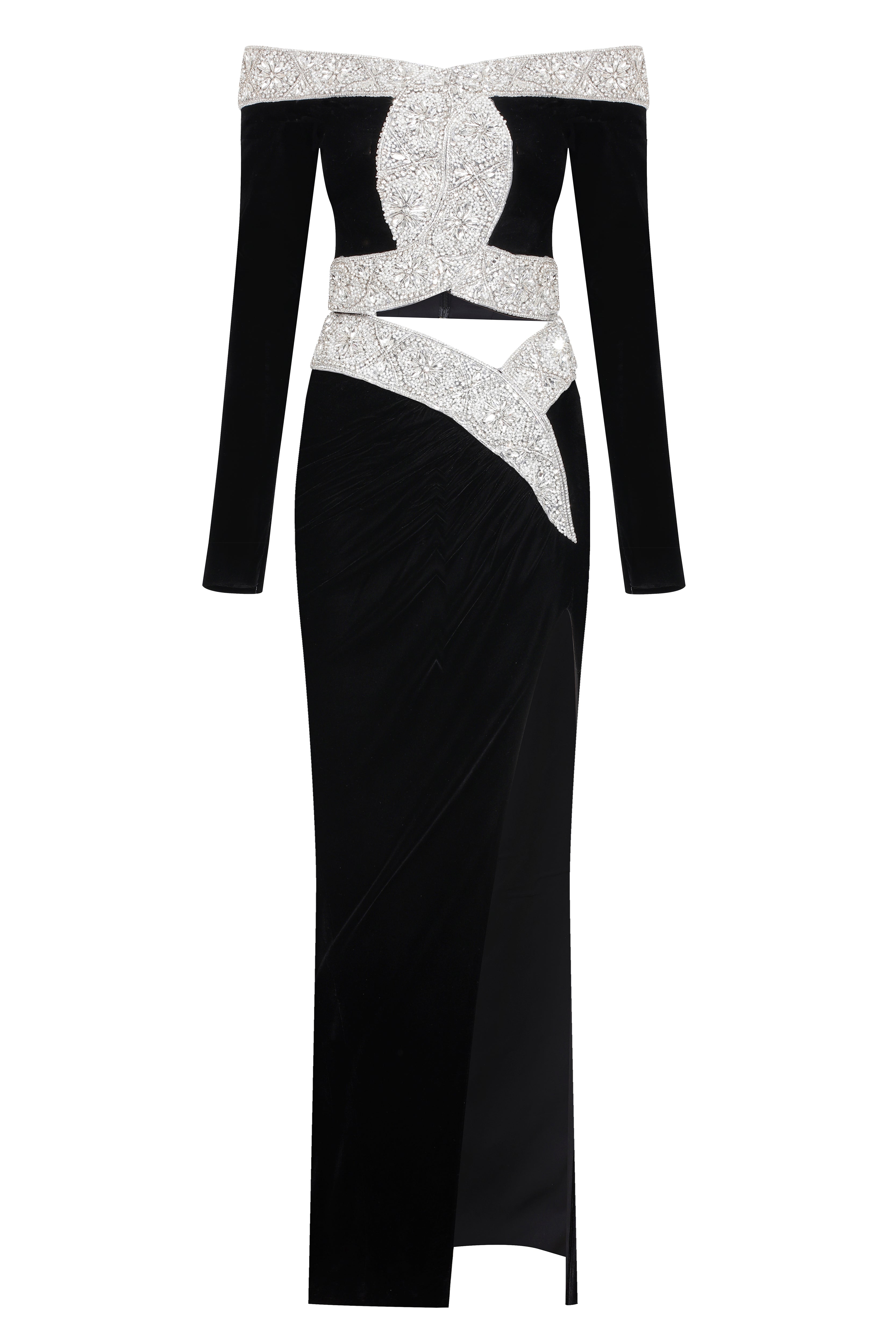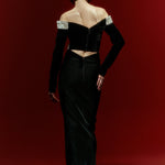 Off Shoulders Black Velvet Midi Dress with Crystal Beading and High Slit