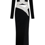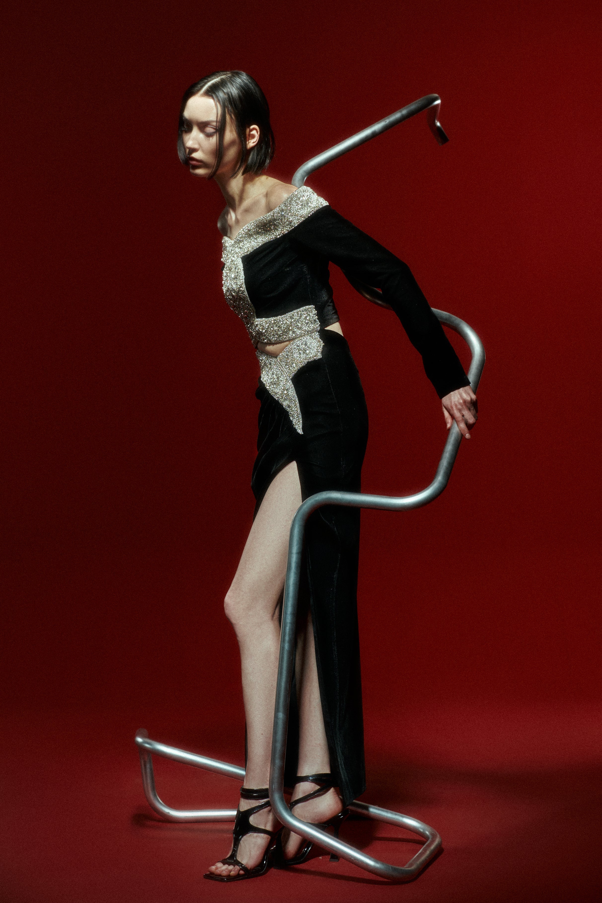 A velvet midi dress crystal embellishment down the front, designed with high slit.