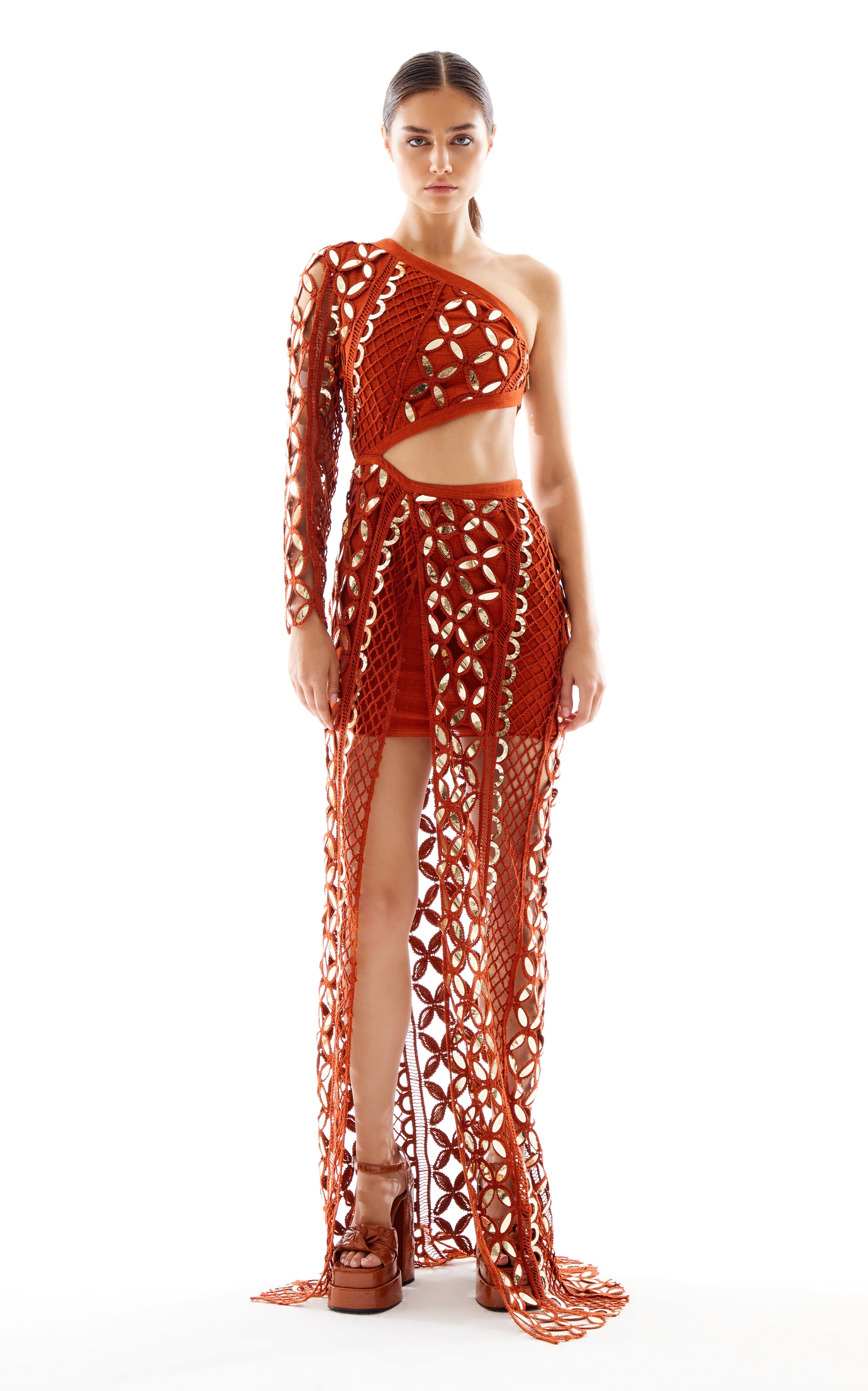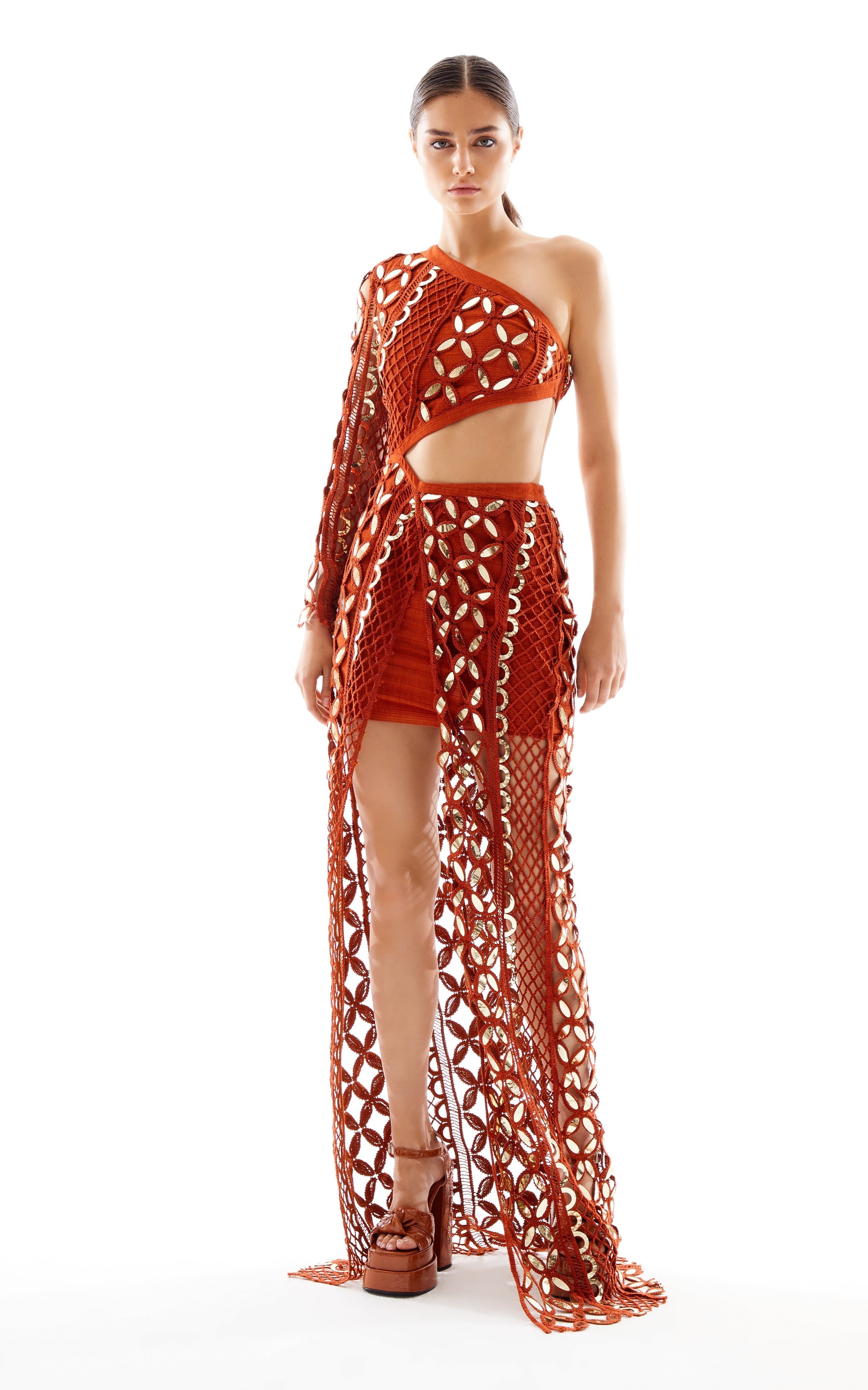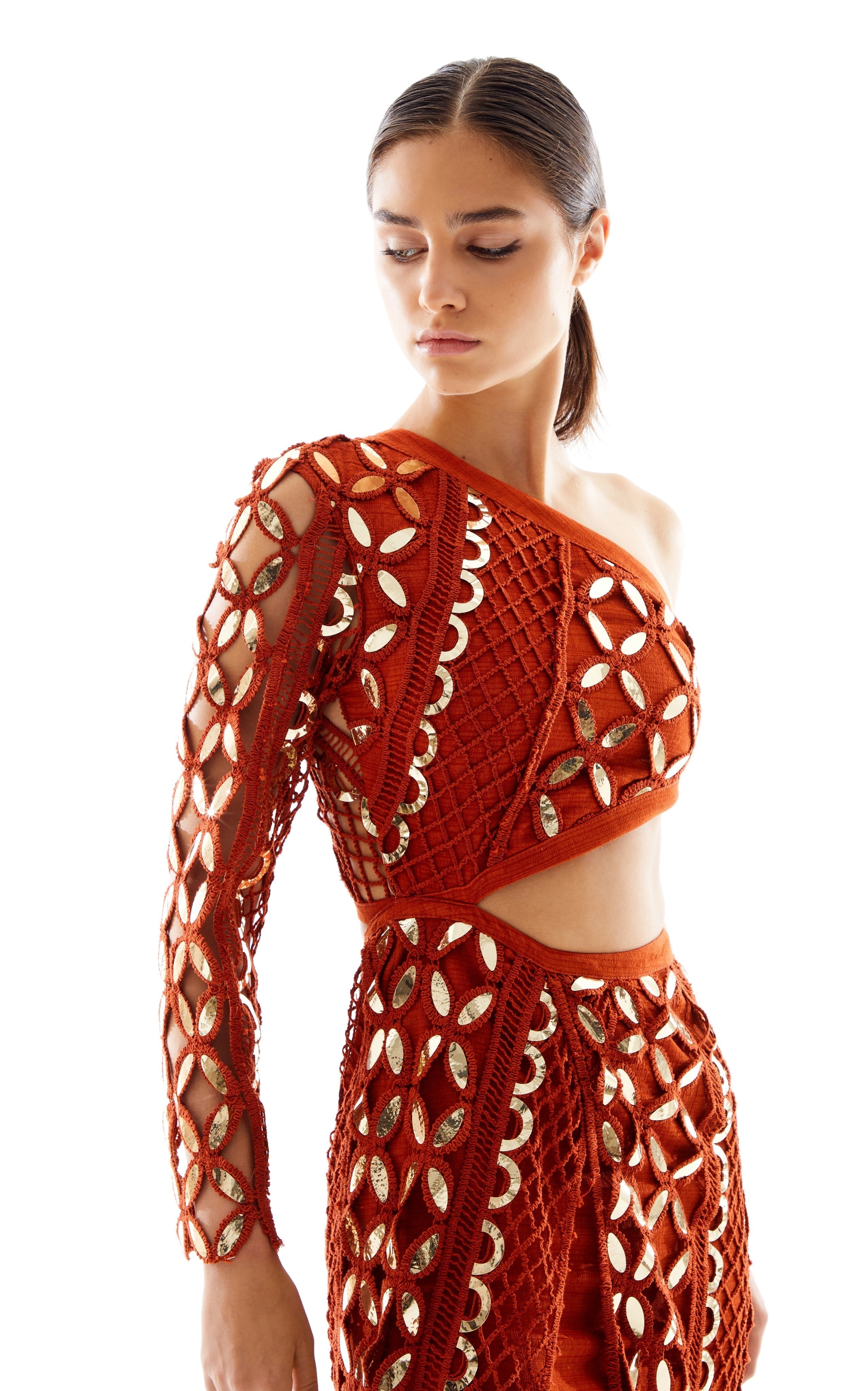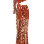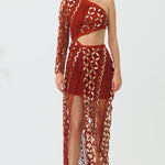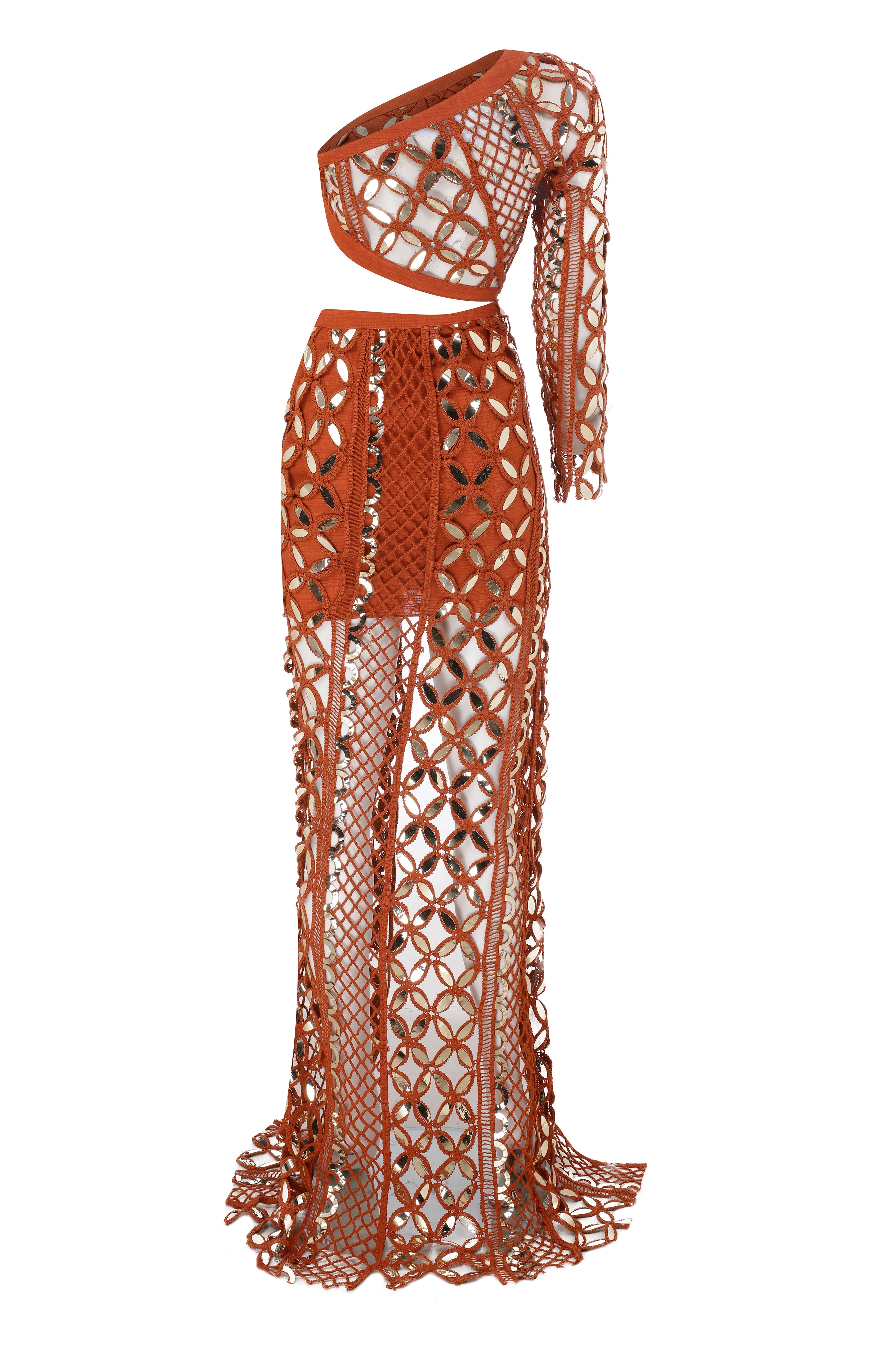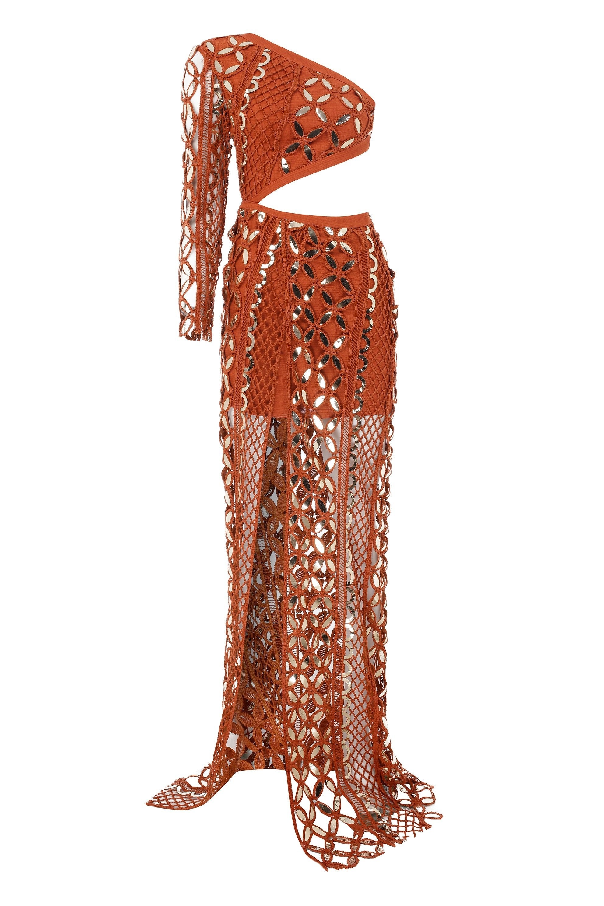 One Shoulder Crystal Embellishements Lace Maxi Dress with Hologram Details