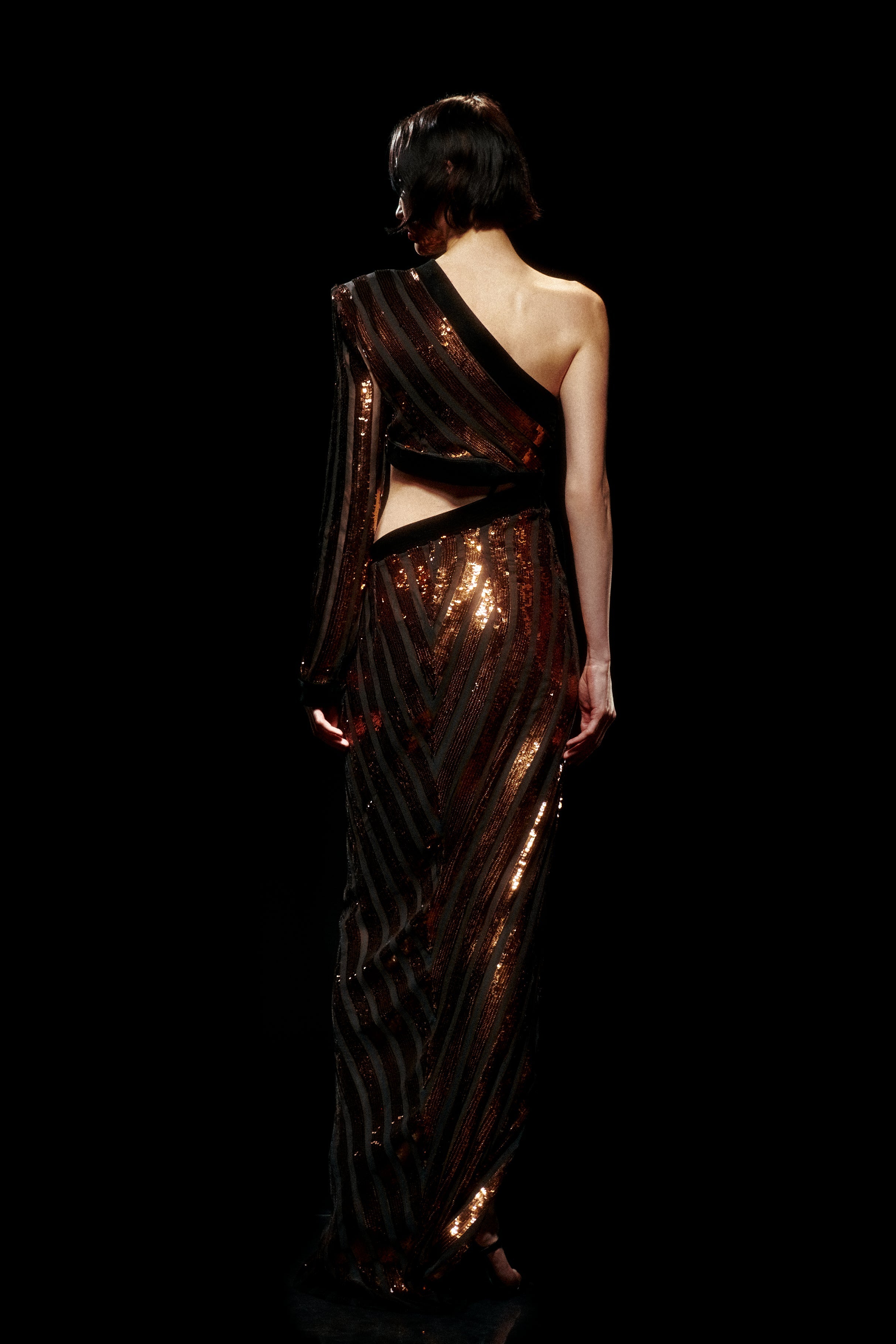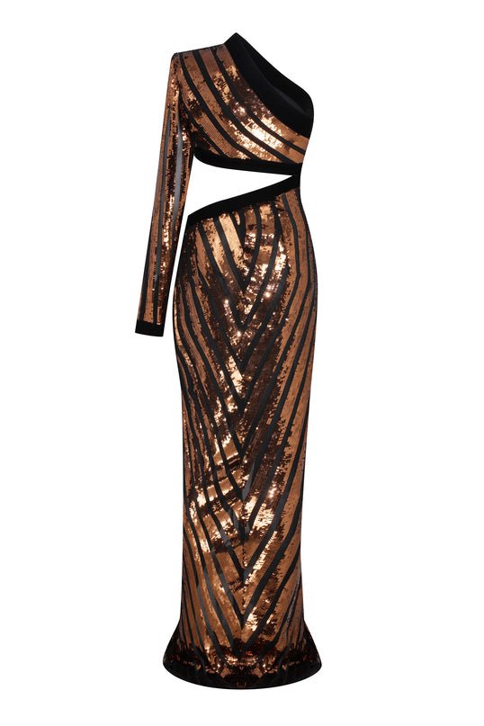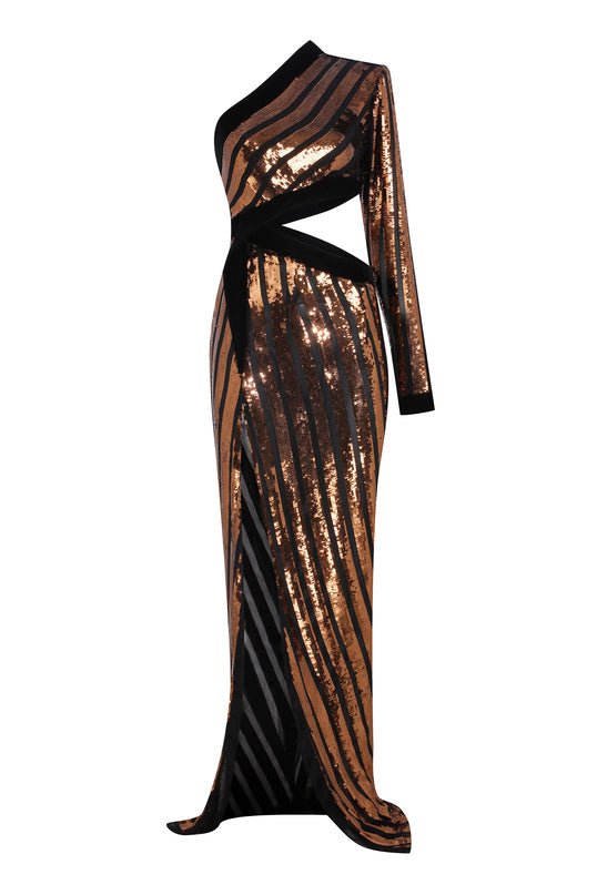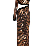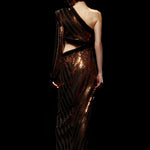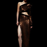 One Shouldered Black/Bronze Sequined Chiffon Maxi Dress with High Slit