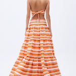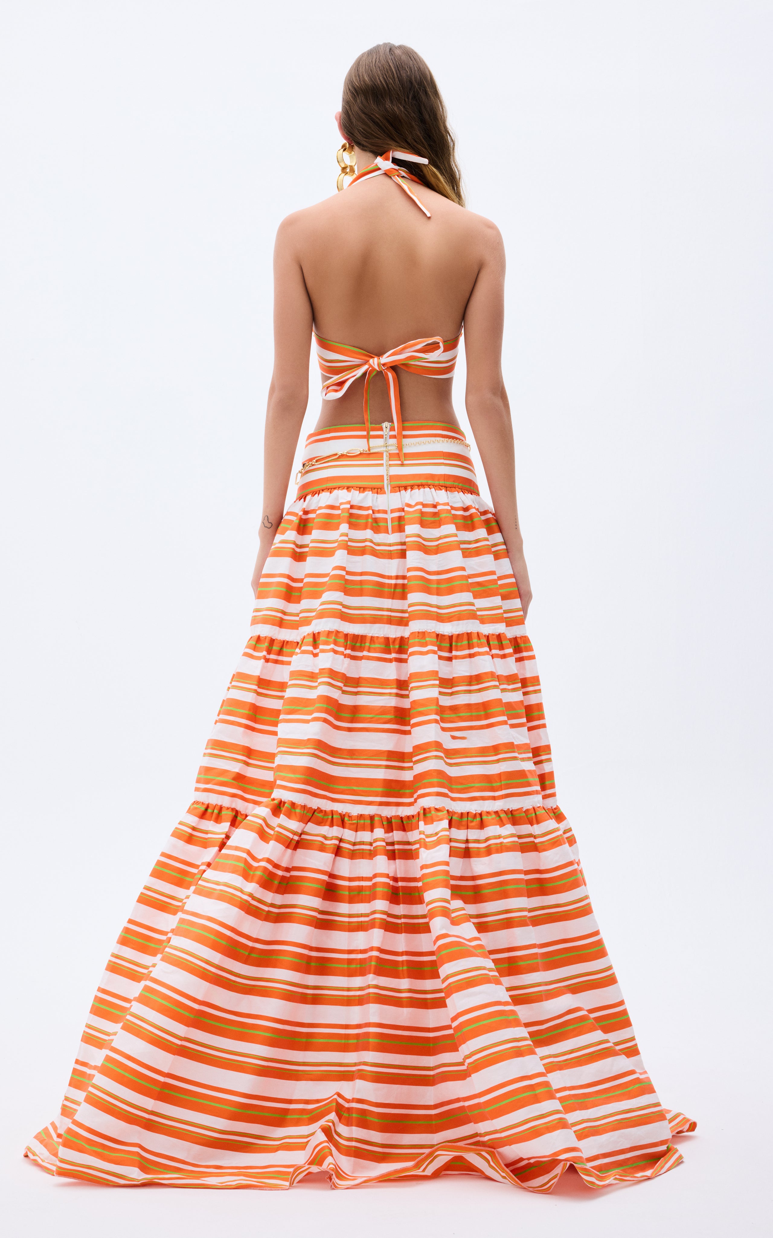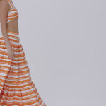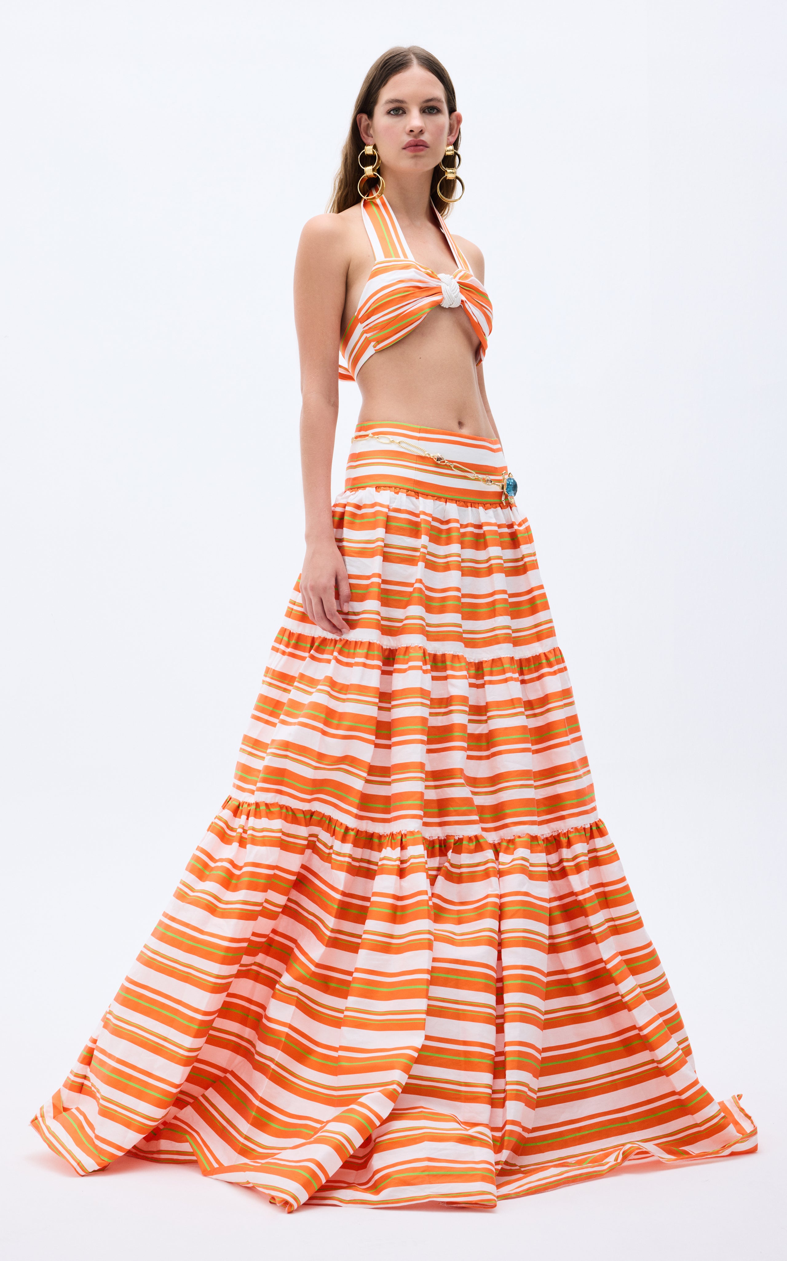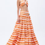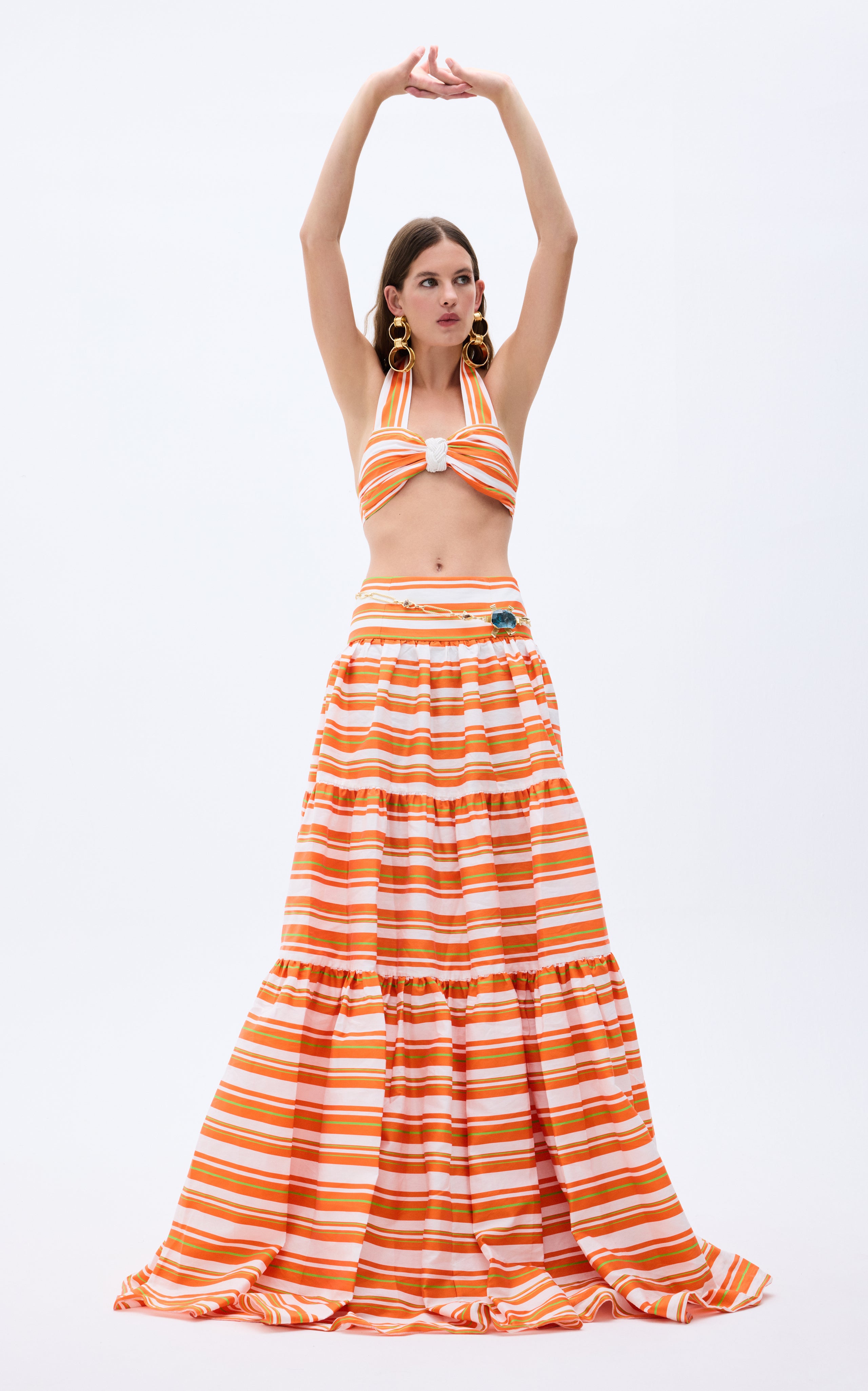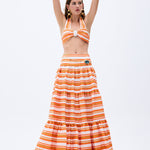 This orange marine maxi skirt radiates warmth and style with its vibrant hue and flowing silhouette. The lightweight fabric drapes beautifully, offering both comfort and elegance. Perfect for a beach day or a breezy evening out, it’s a statement piece that pairs effortlessly with its matching orange marine top.
