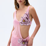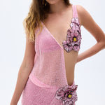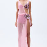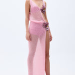 Pink Sequined Net Gown With Flower Embroidery And Slit Detail