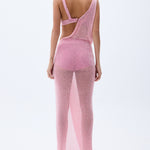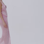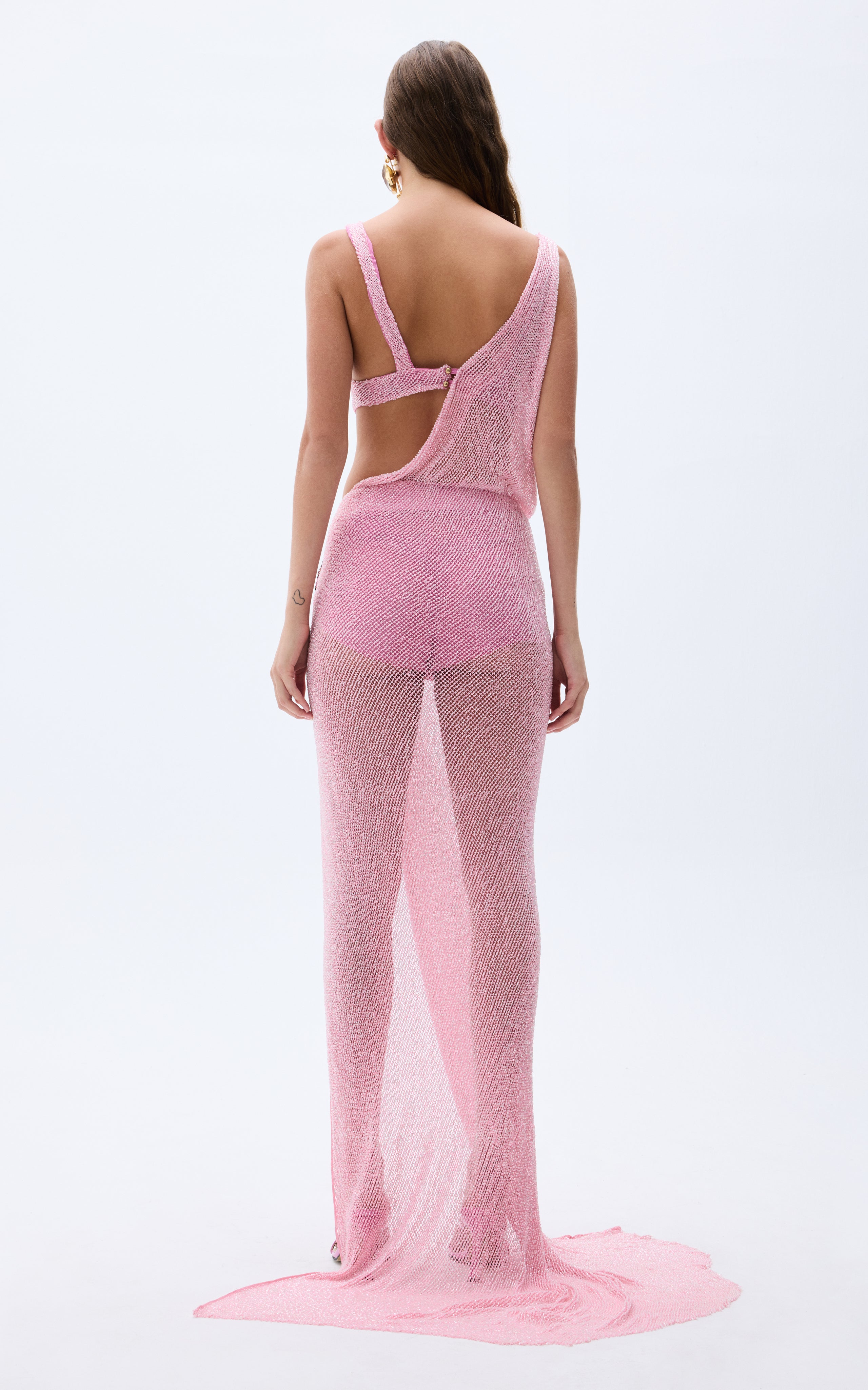 Dazzle in this pink sequined net gown, where intricate flower embroidery meets shimmering elegance. The delicate netting is adorned with sparkling sequins, creating a stunning, reflective effect with every movement. A daring slit detail adds an element of allure, making this gown the perfect choice for a luxurious evening event or a red-carpet-worthy look.