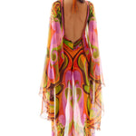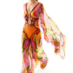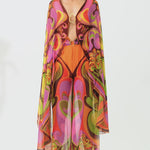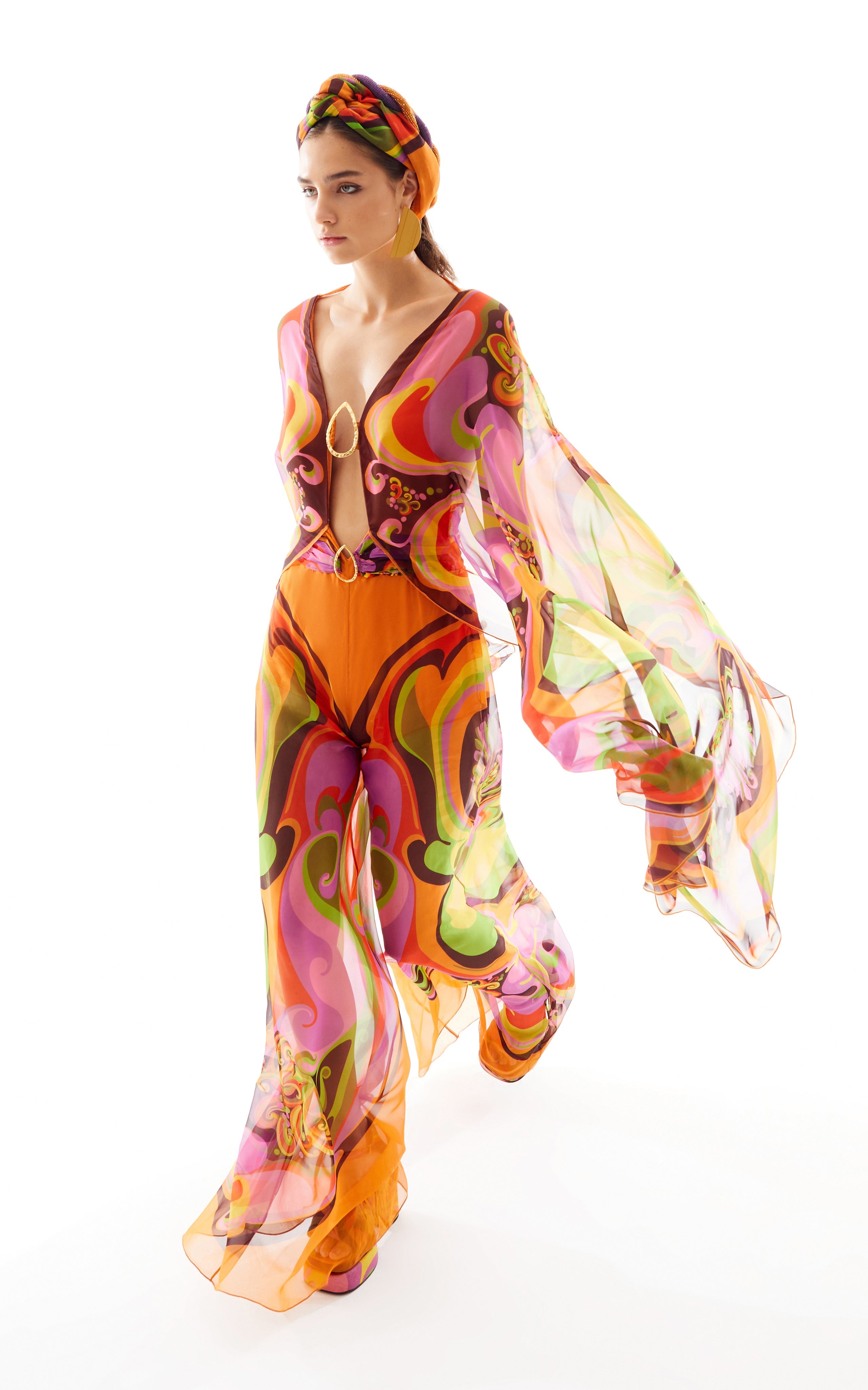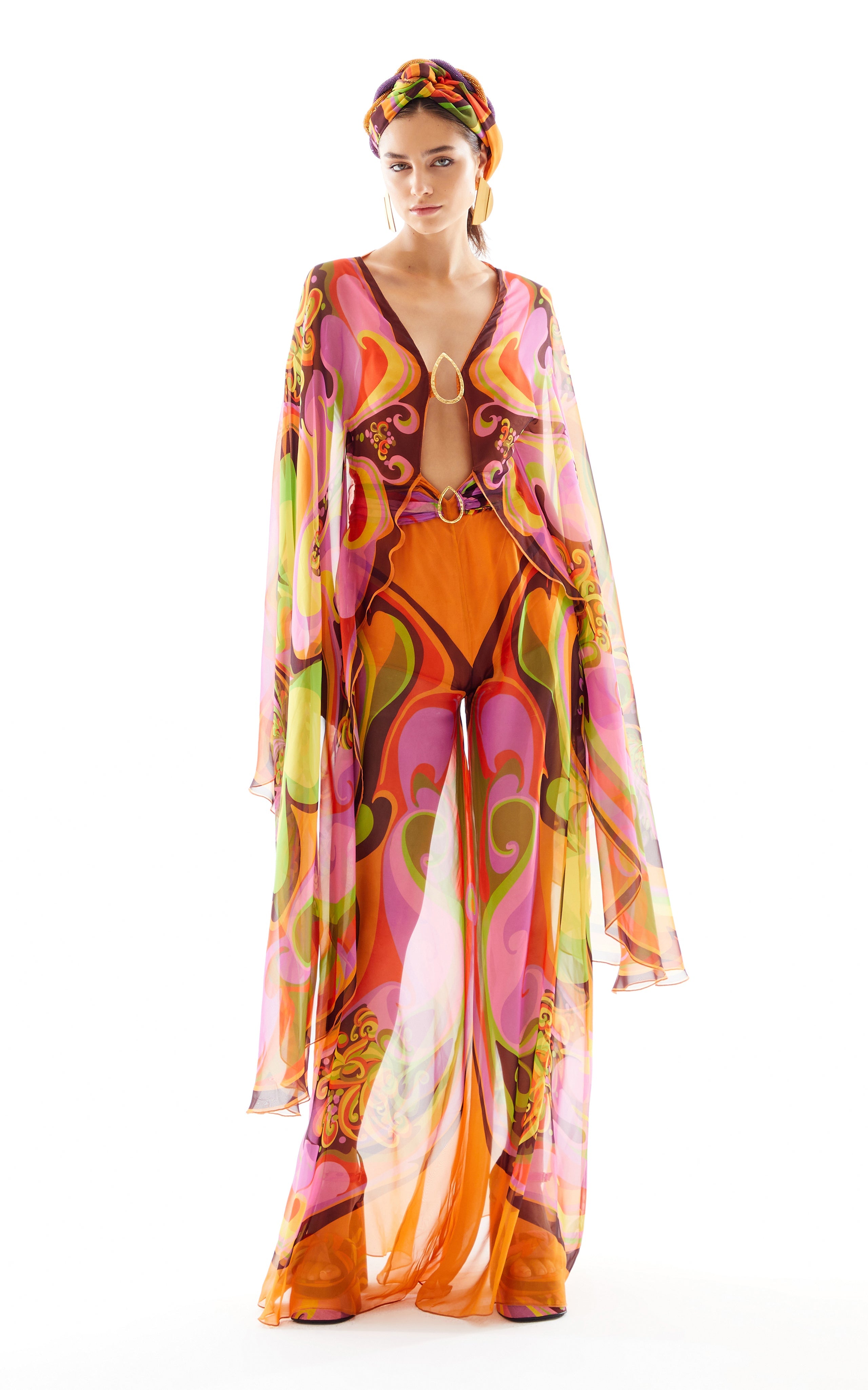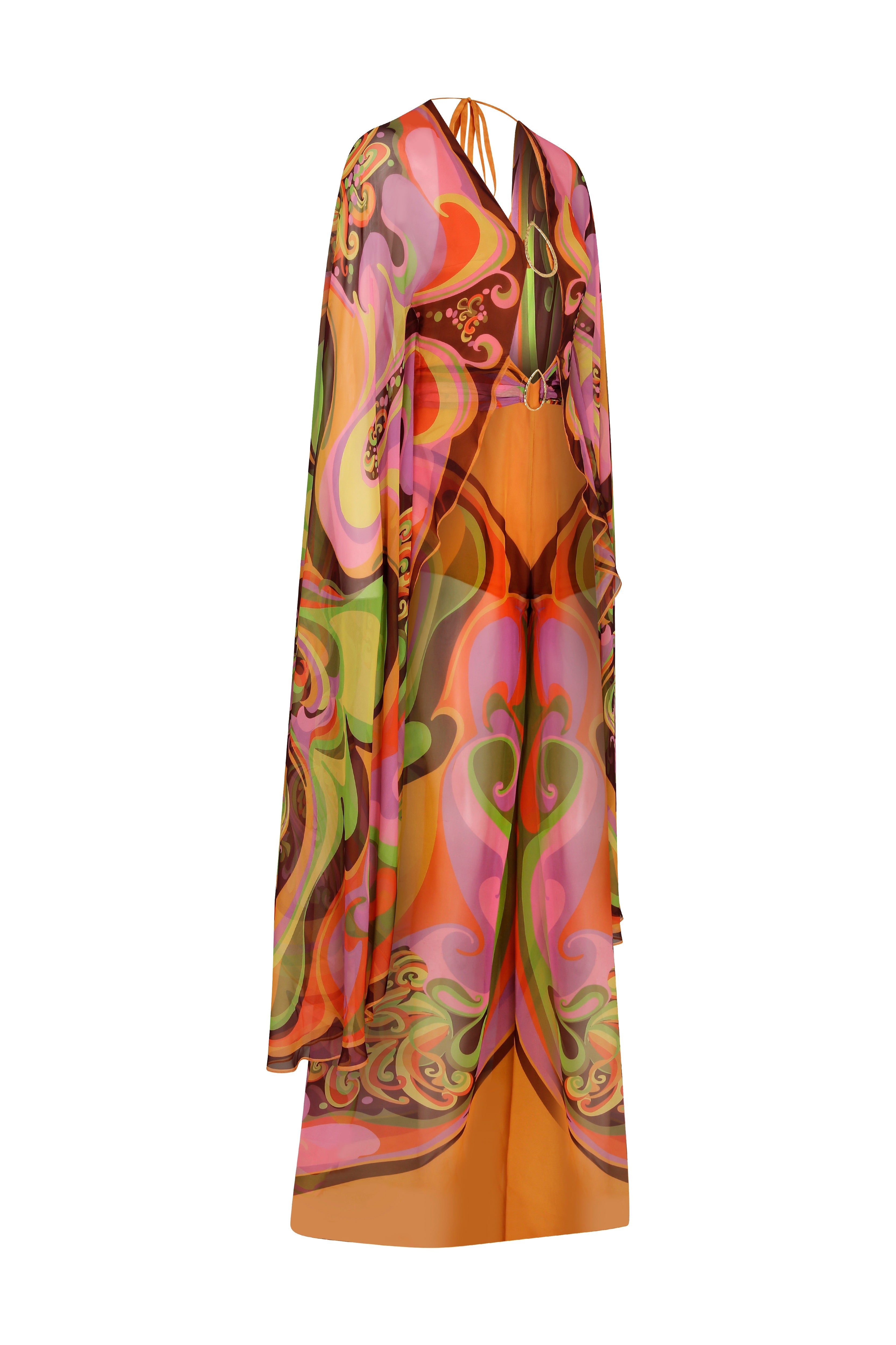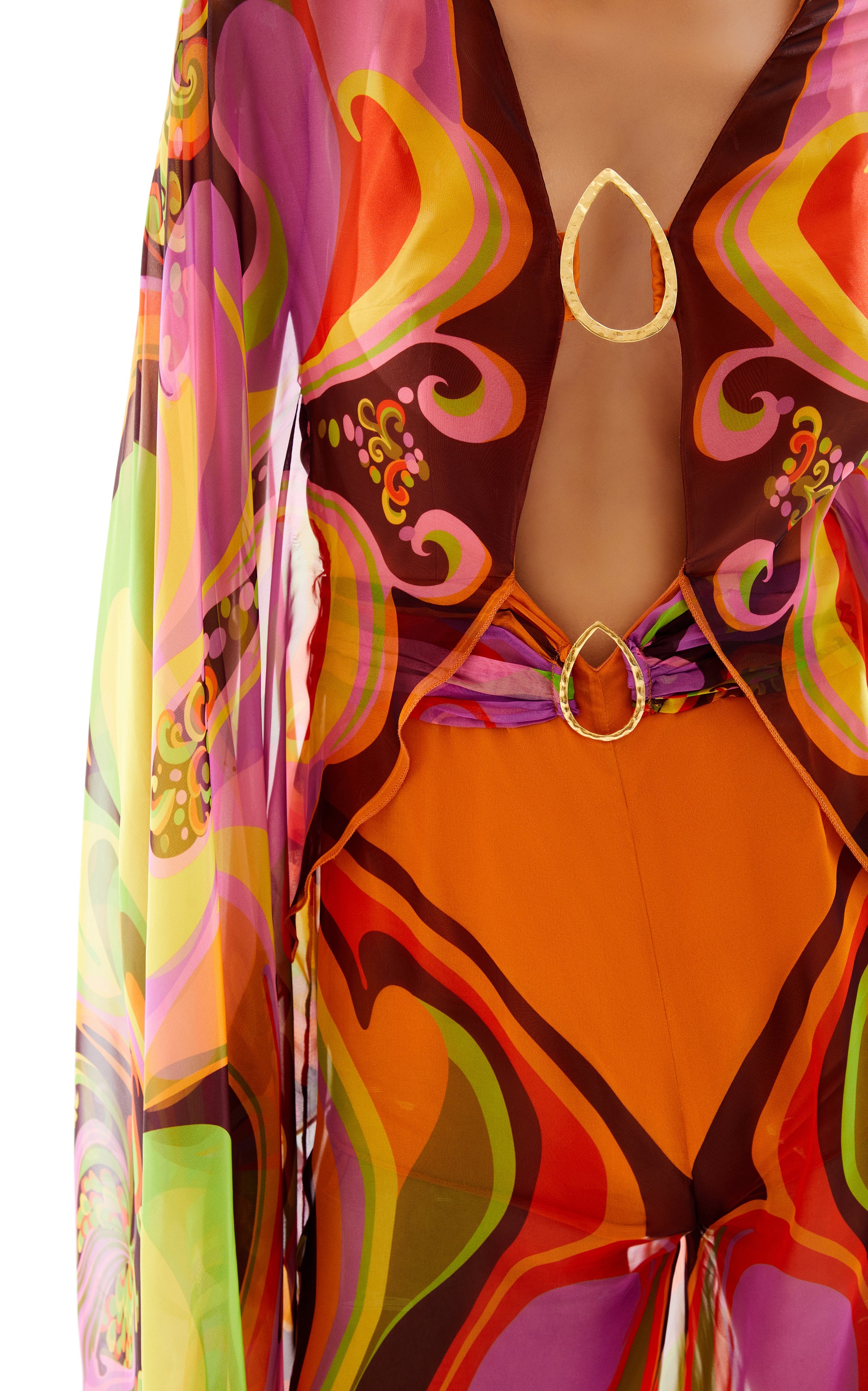 Printed Chiffon Jumpsuit with Deep Neck and Gold Buckle