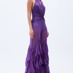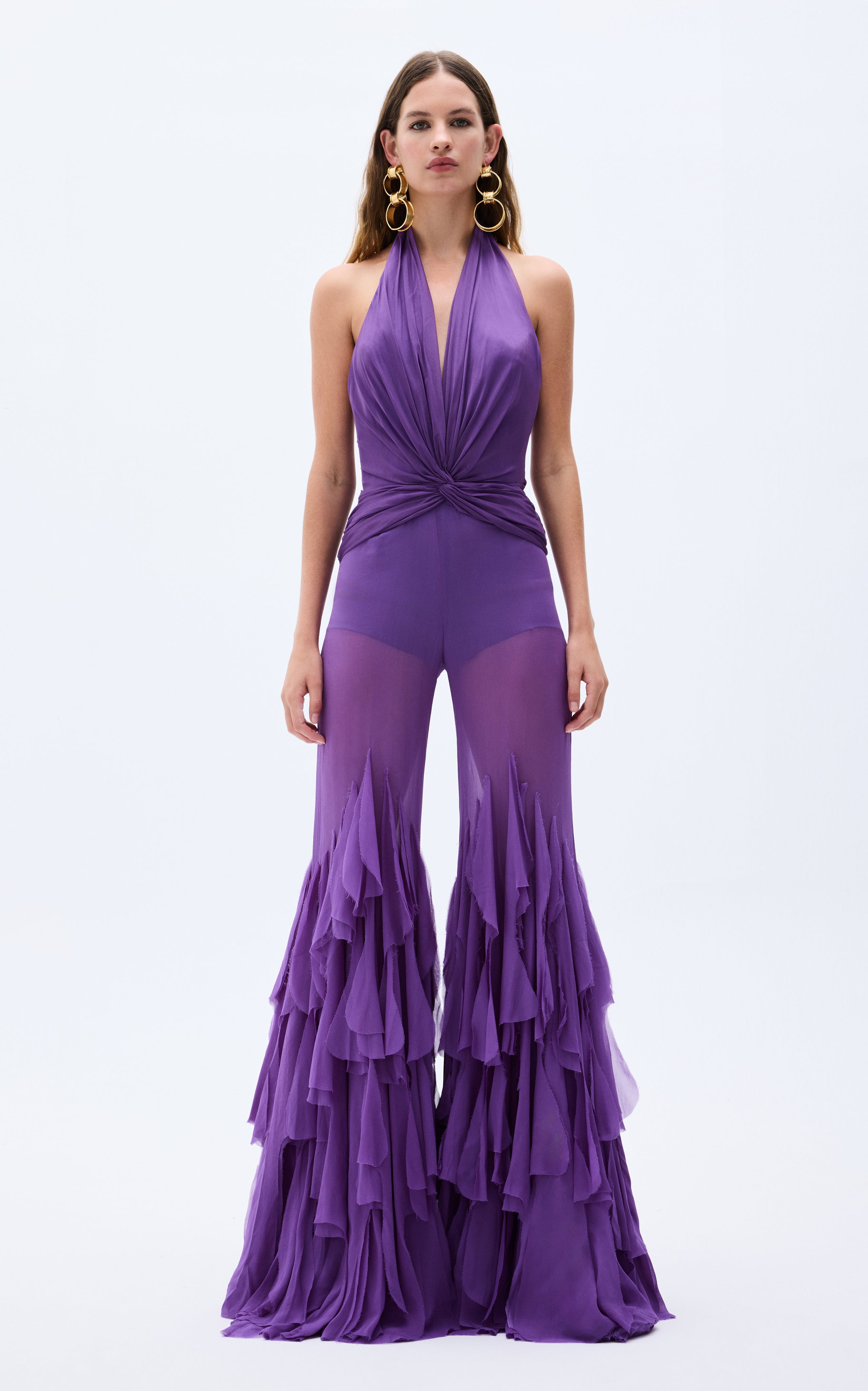 The purple chiffon jumpsuit features elegant laser-cut frilled cuffs, adding a modern twist to its flowing, ethereal design. Its bold color and intricate detailing make it a chic and standout piece for any occasion.