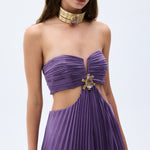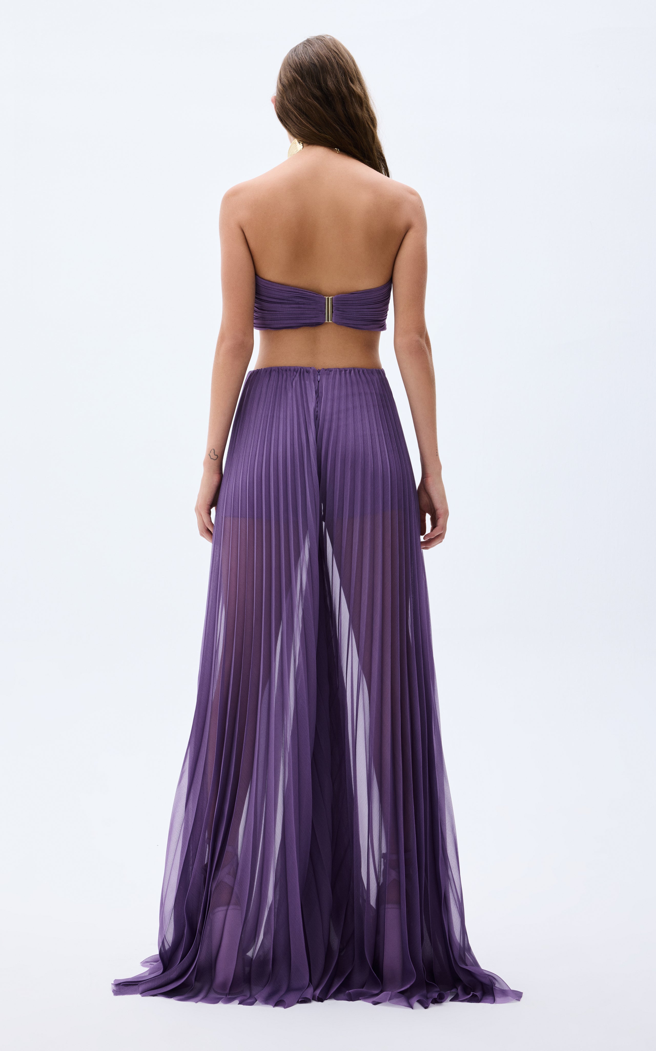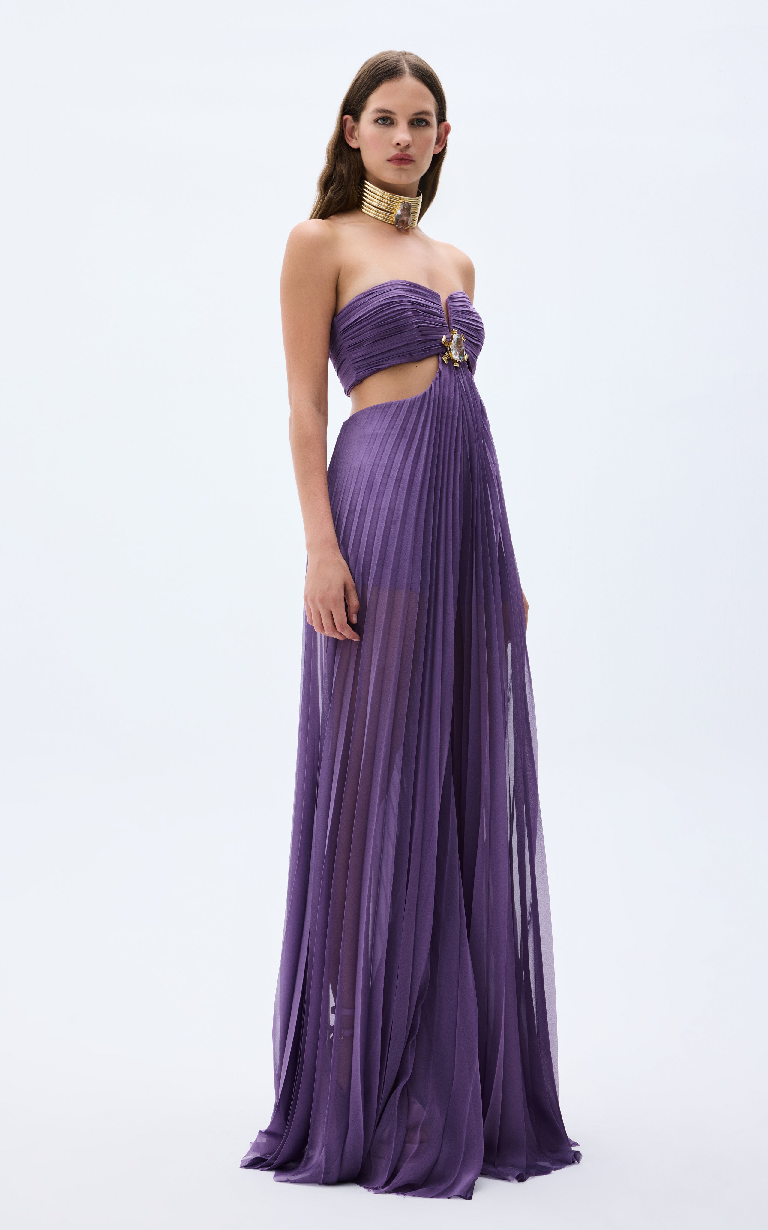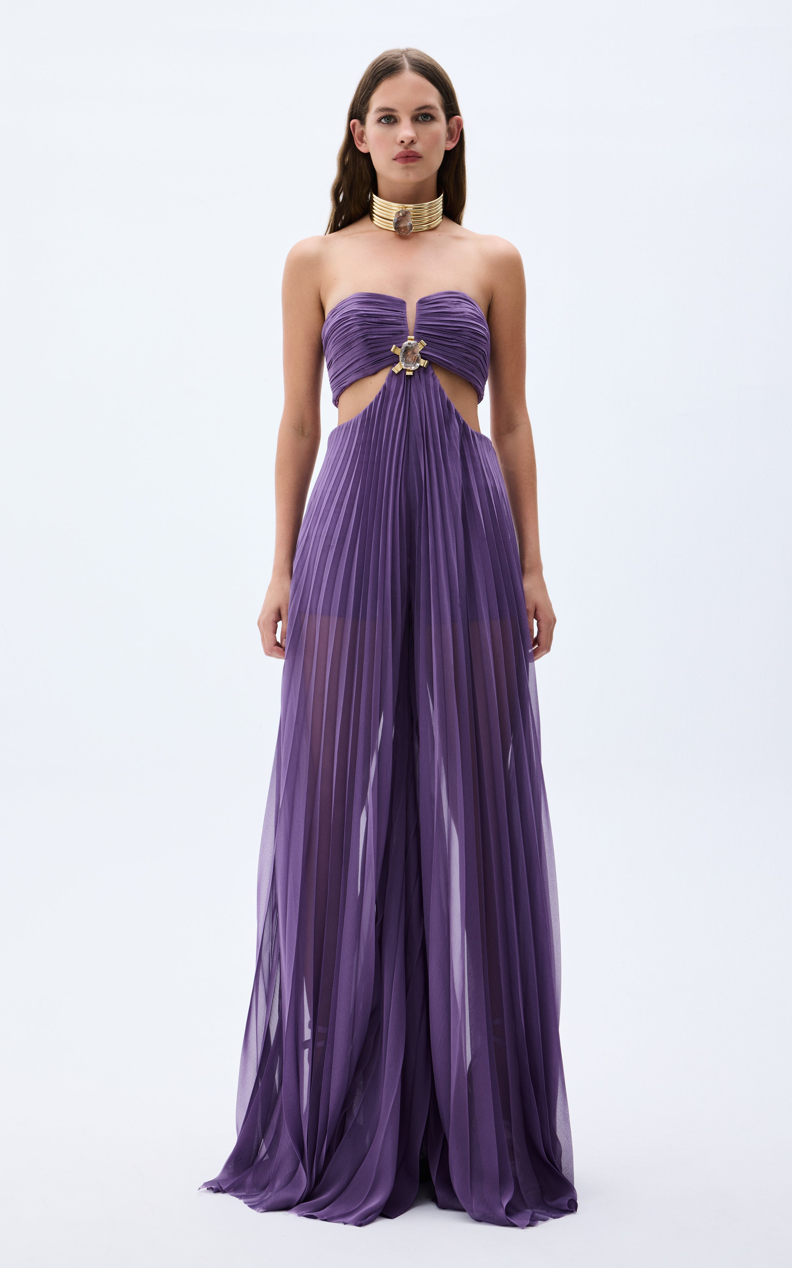 The purple pleated chiffon jumpsuit is enhanced with sparkling Swarovski stones, offering a blend of grace and glamour. Its draped silhouette and exquisite details make it a standout piece for any elegant event.