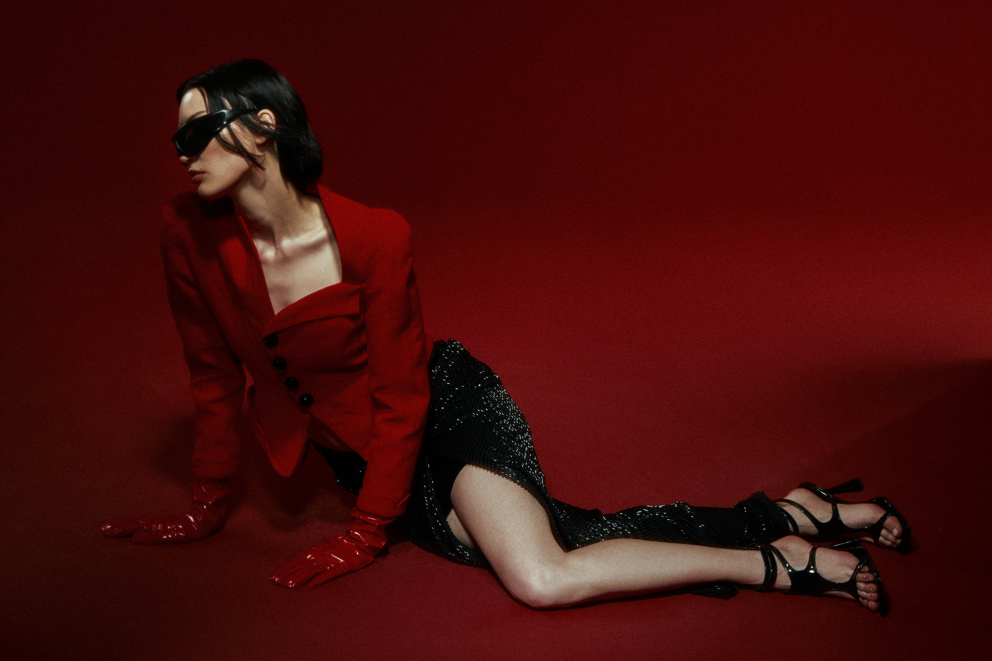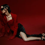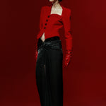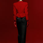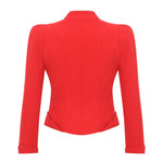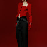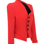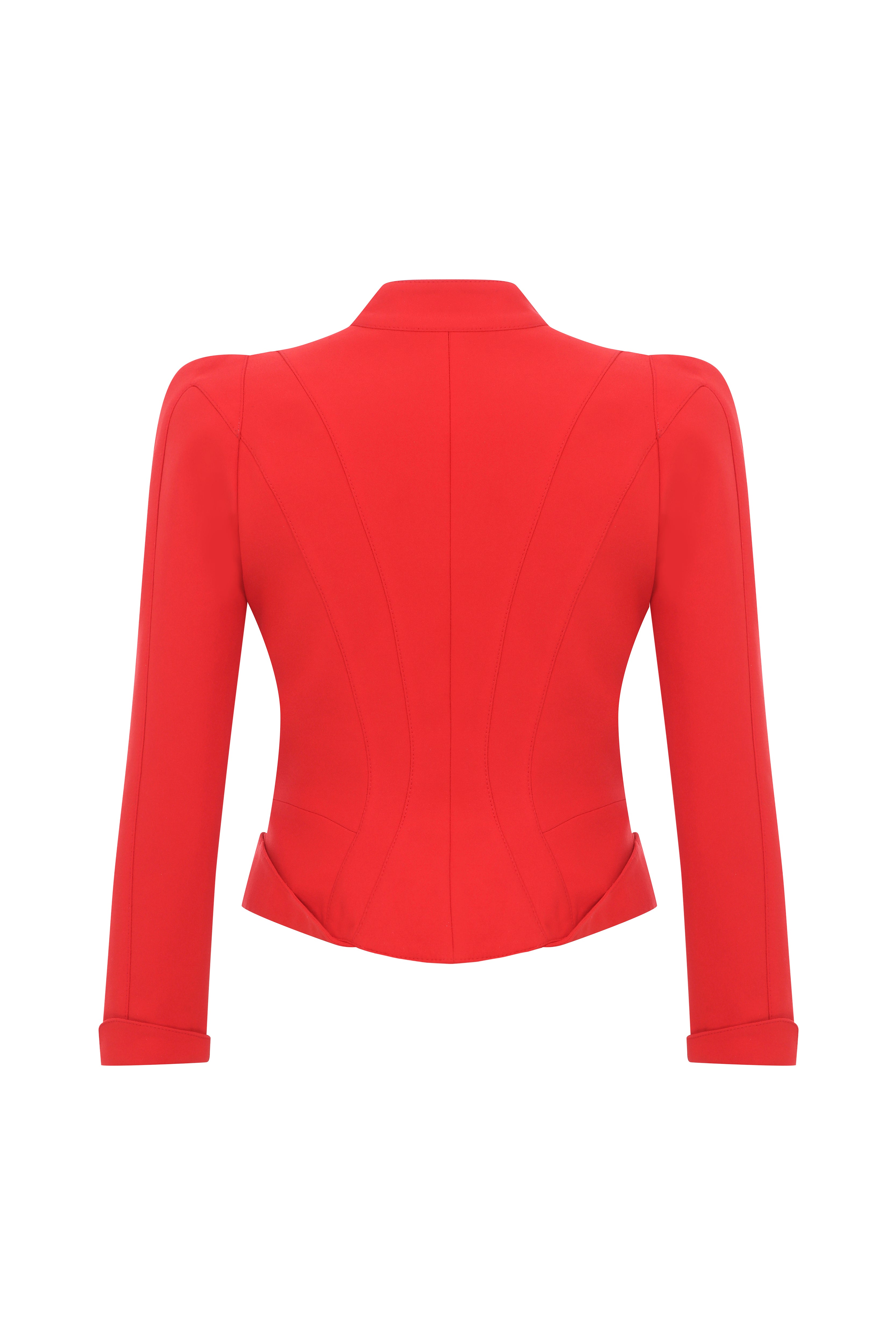 This structured red crepe jacket has a unique asymmetrical neckline.