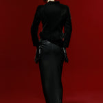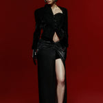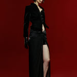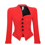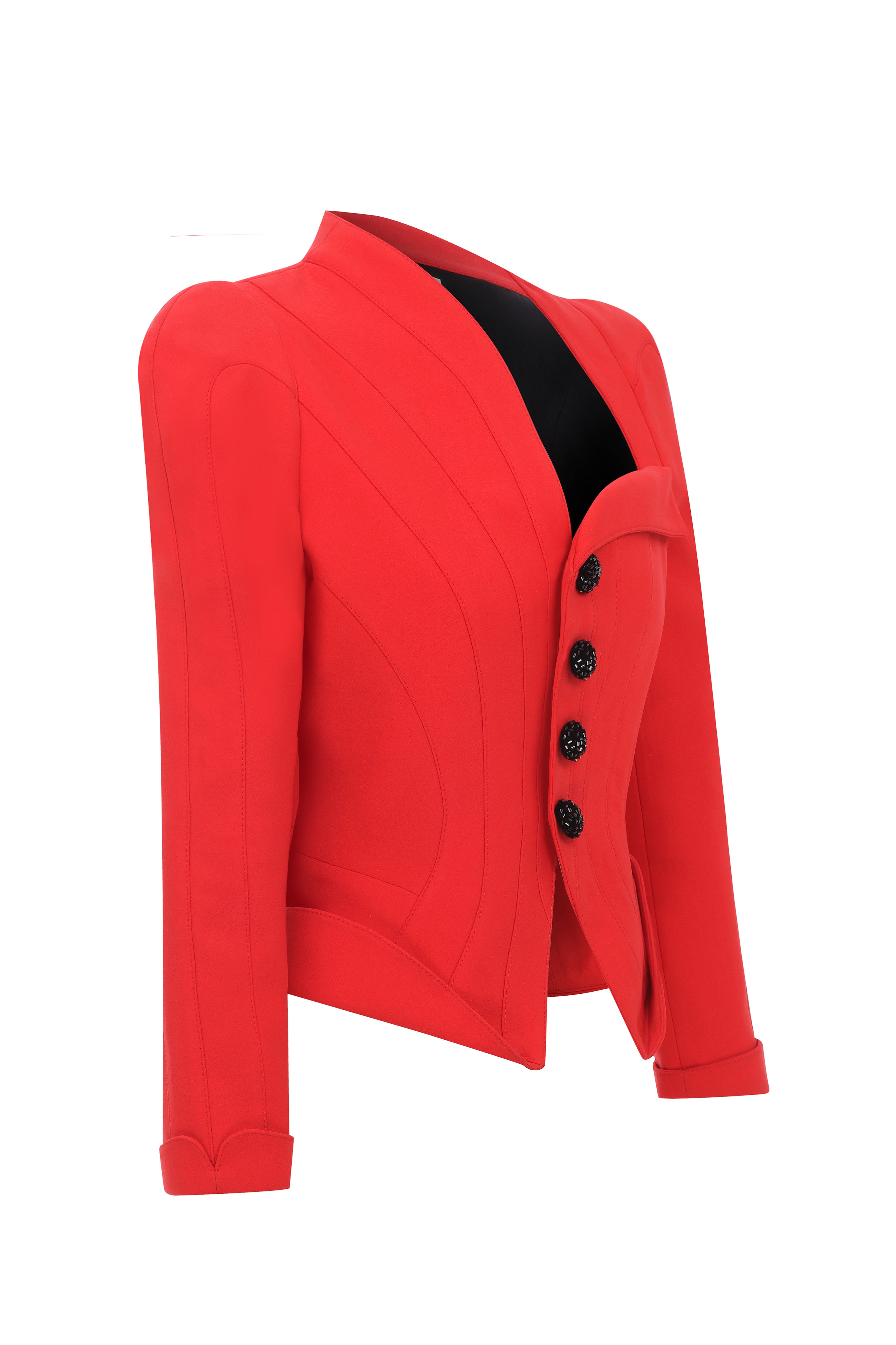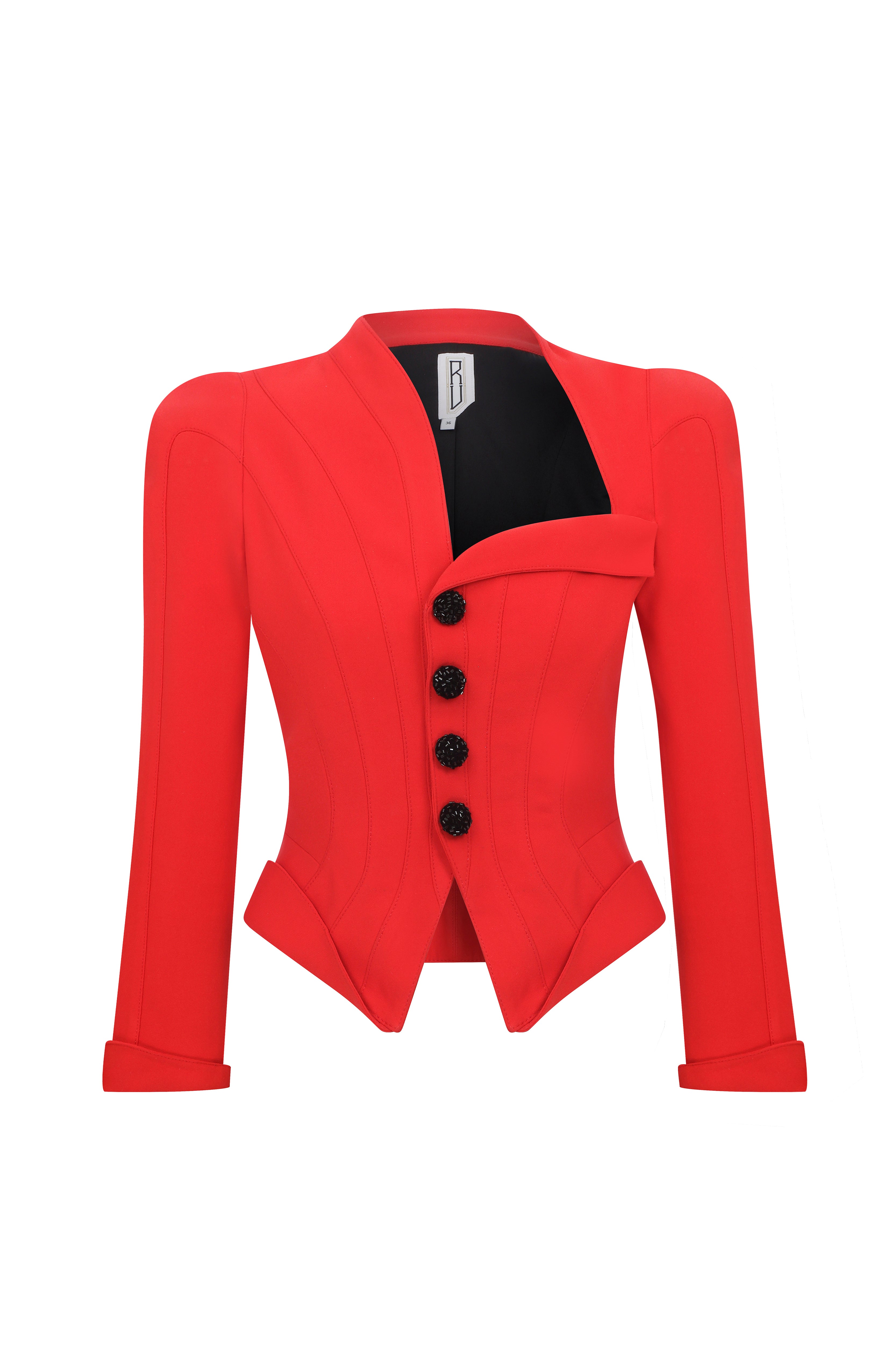 Red Crepe Asymmetric Neck Jacket With Black Stone Buttons