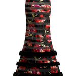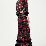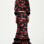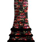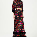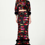 Red Flower Printed Stretchy Black Maxi Skirt With Feather Finishing