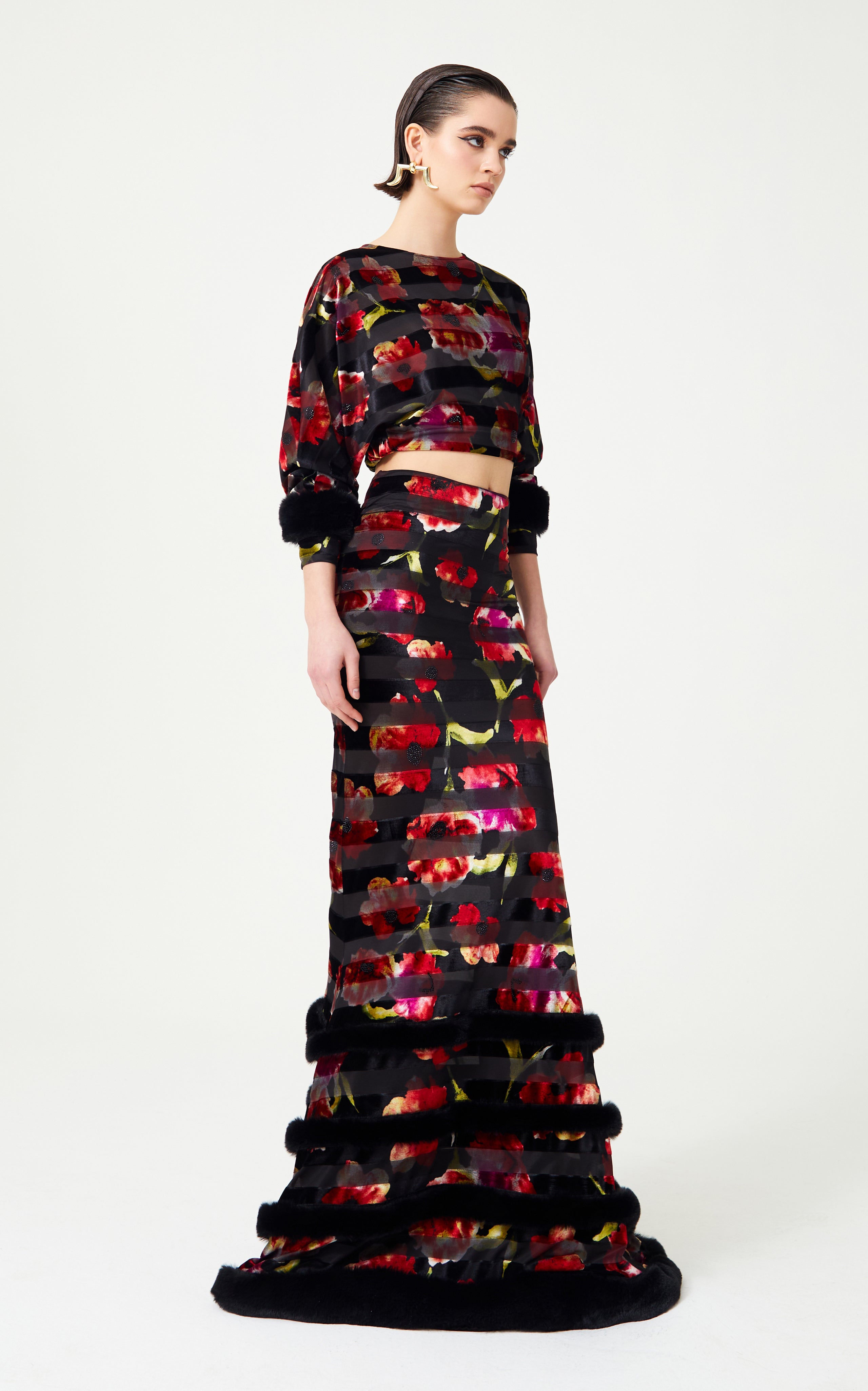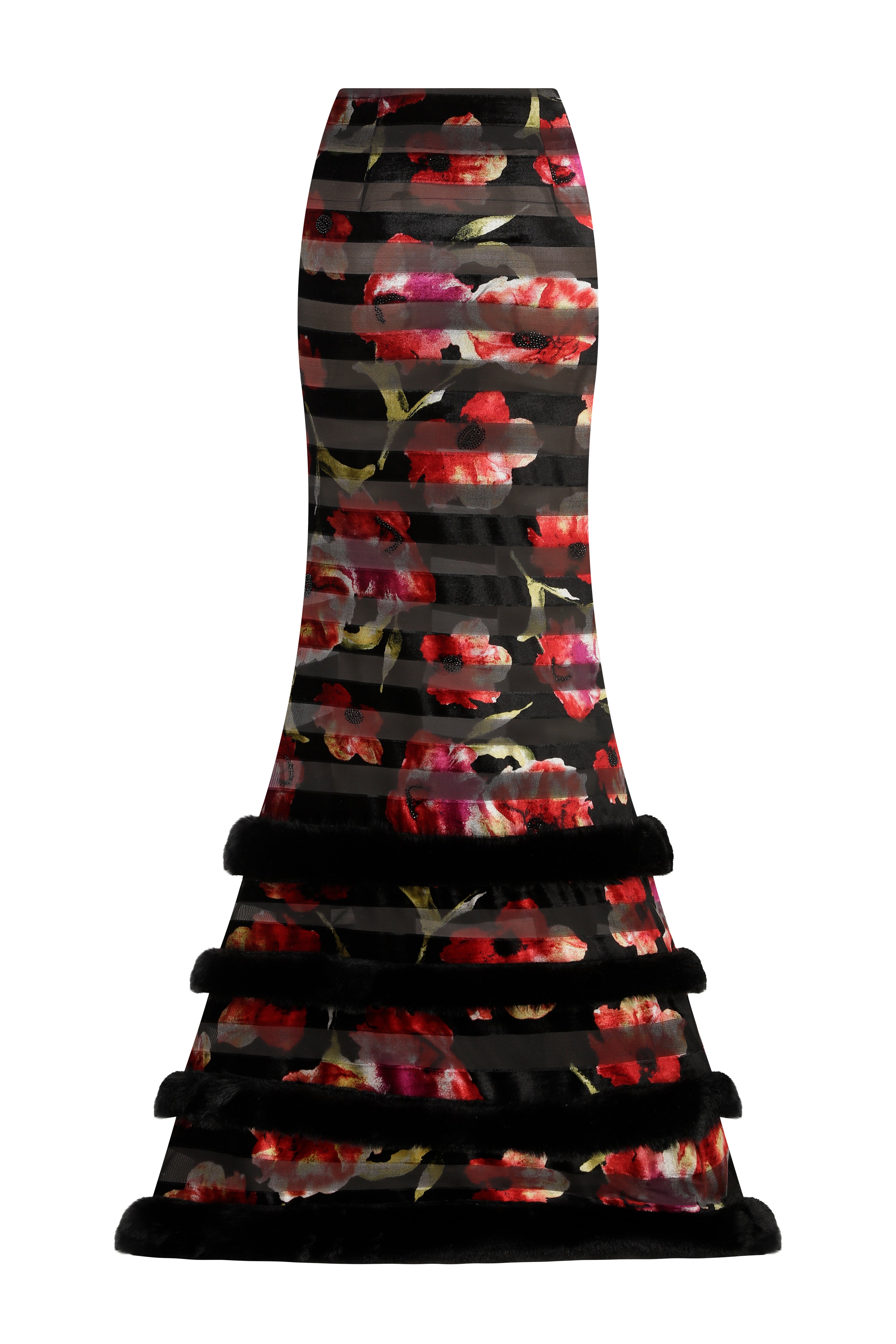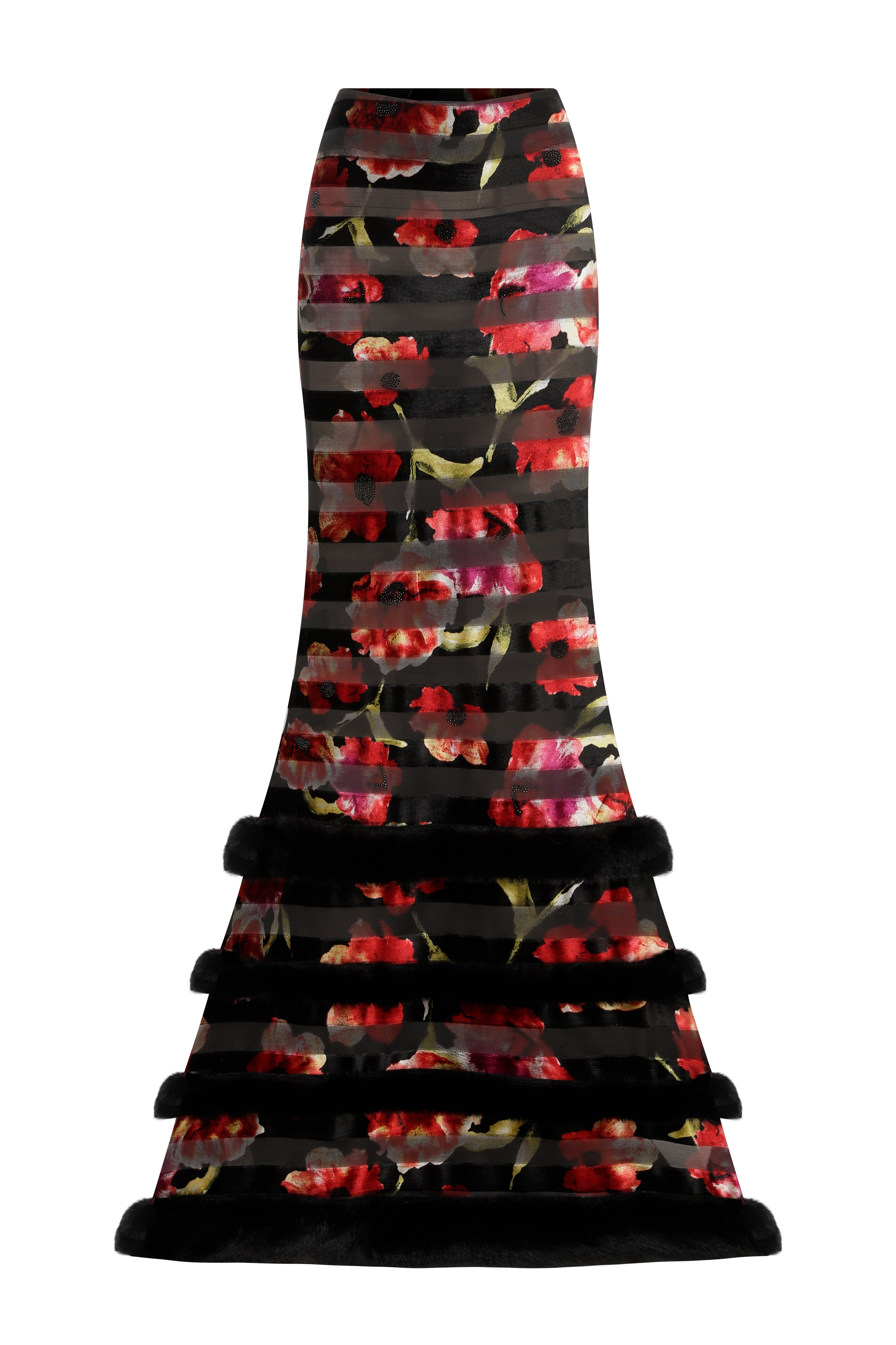 Command attention in this Red Flower Printed Stretchy Black Maxi Skirt. Enhanced with feather finishing adorned with stones, it merges floral sophistication with glamorous details for a captivating, statement-making piece.