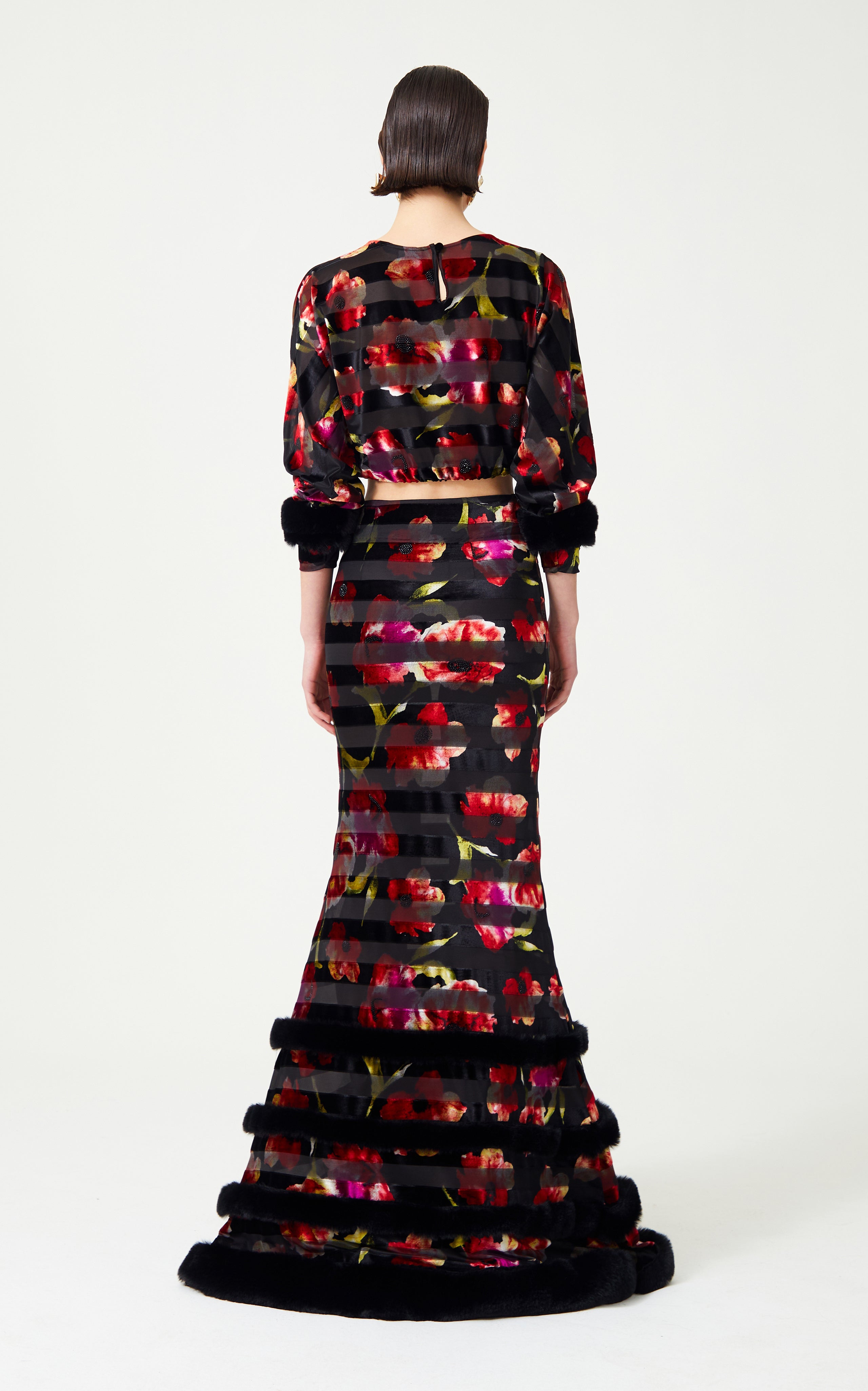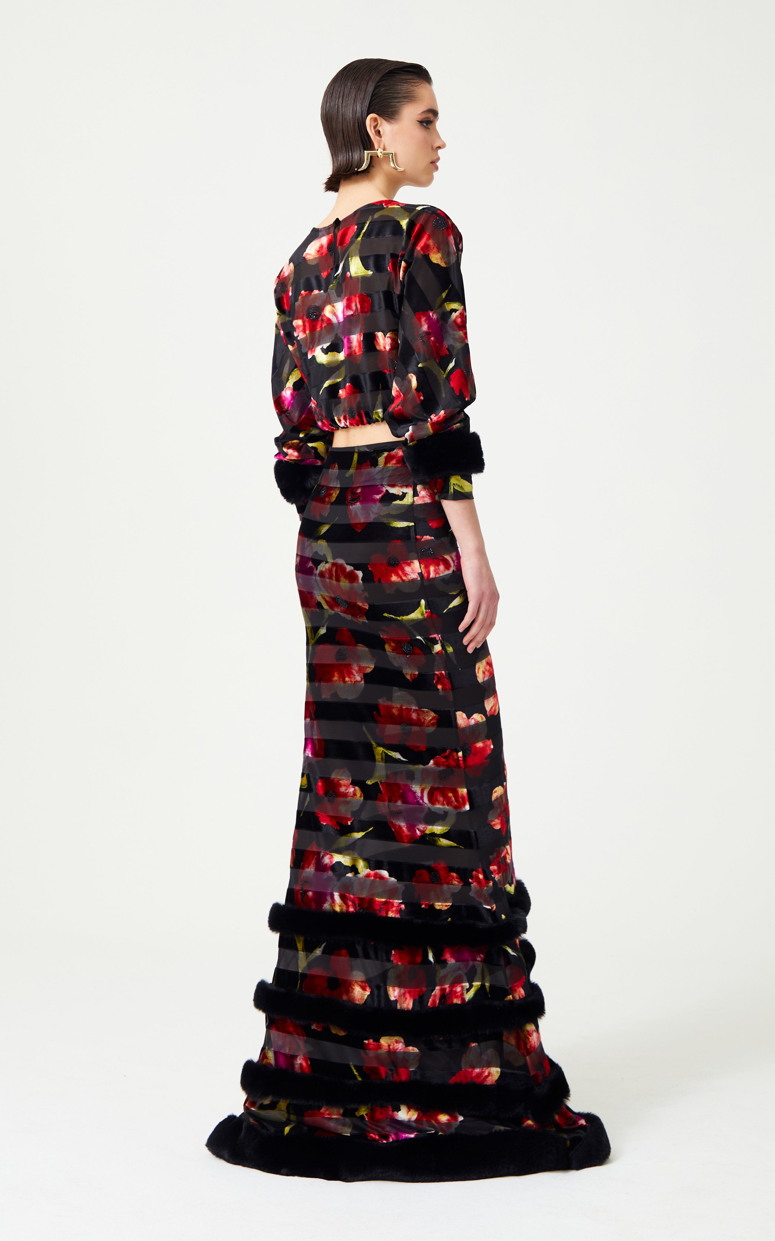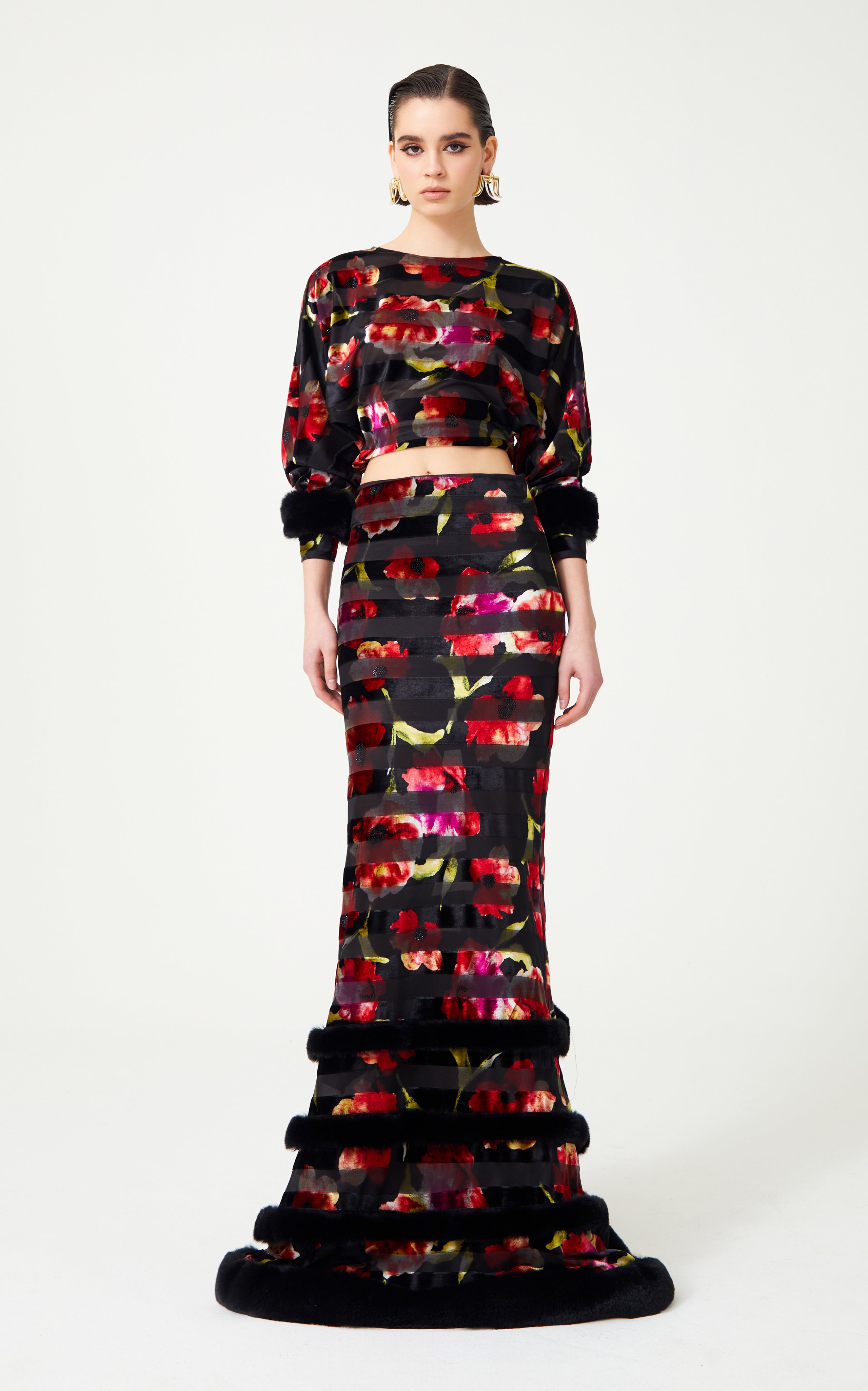 Command attention in this Red Flower Printed Stretchy Black Maxi Skirt. Enhanced with feather finishing adorned with stones, it merges floral sophistication with glamorous details for a captivating, statement-making piece.