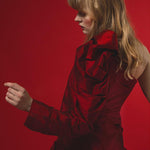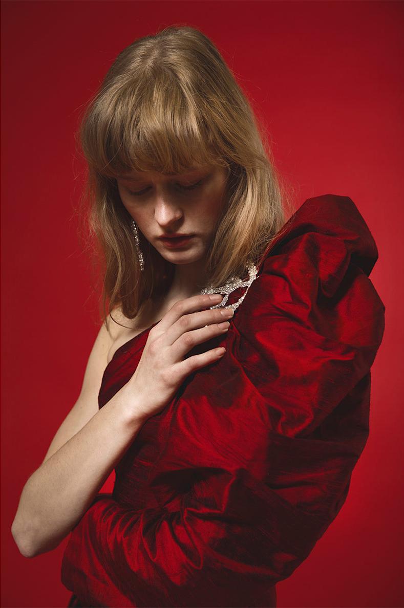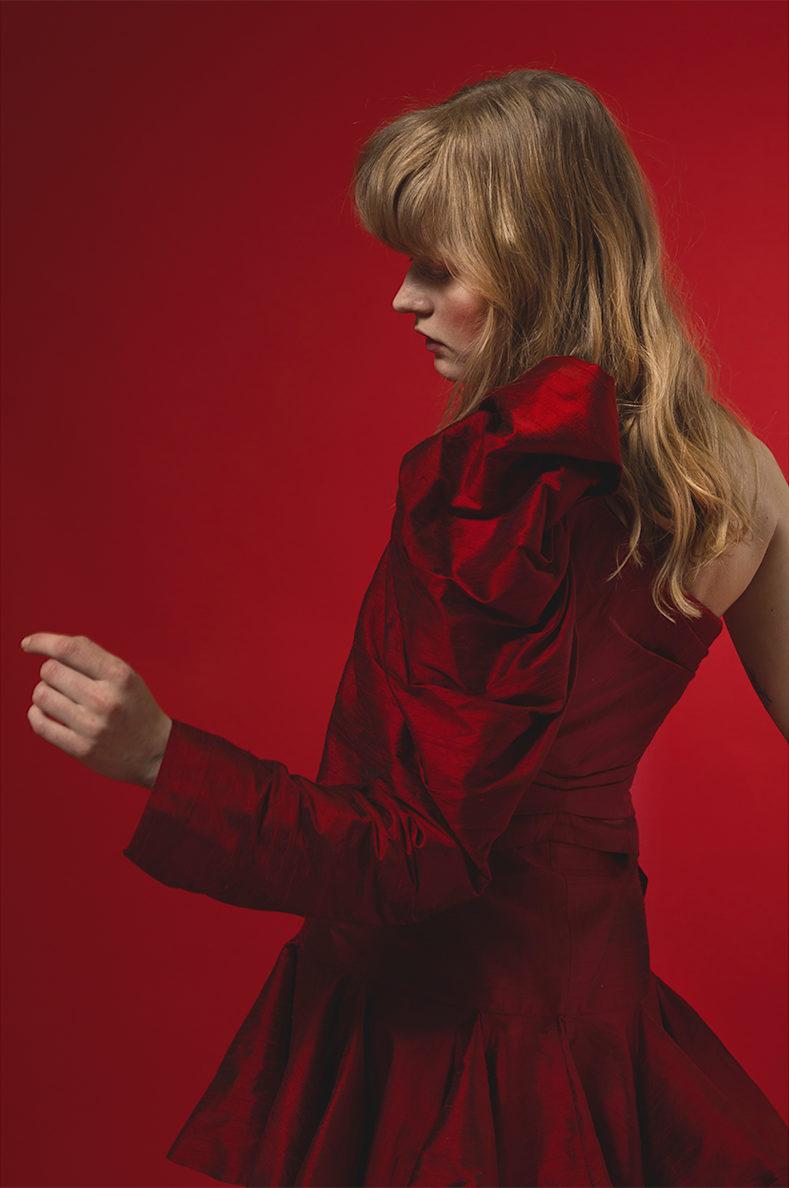 Red Silk Shantung One Shouldered Mini Dress with Crystal Accessories