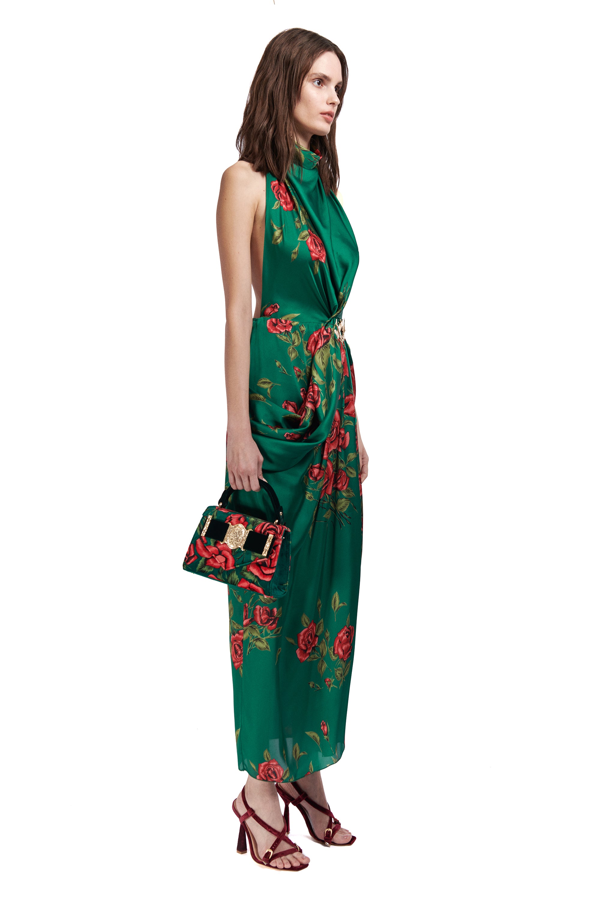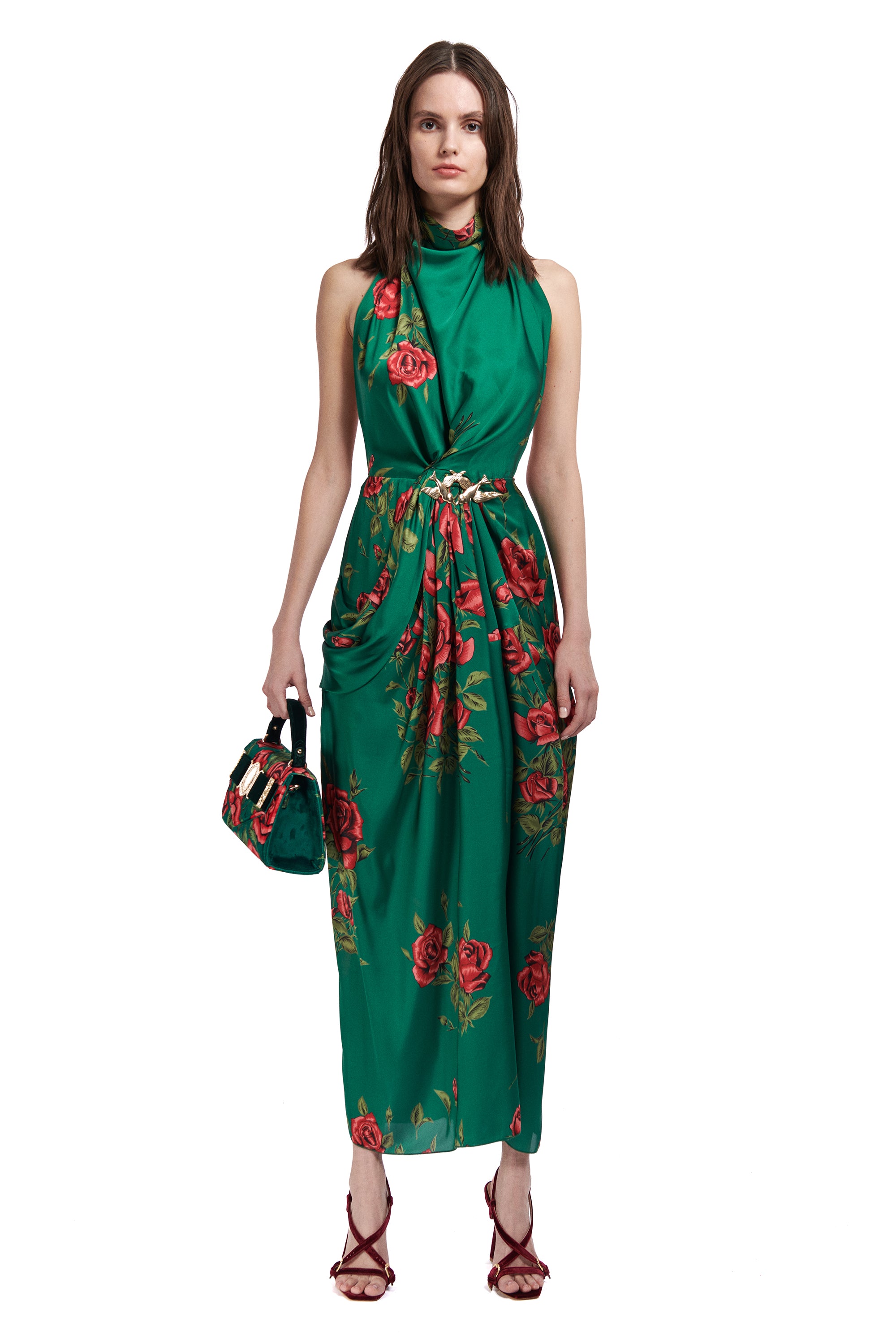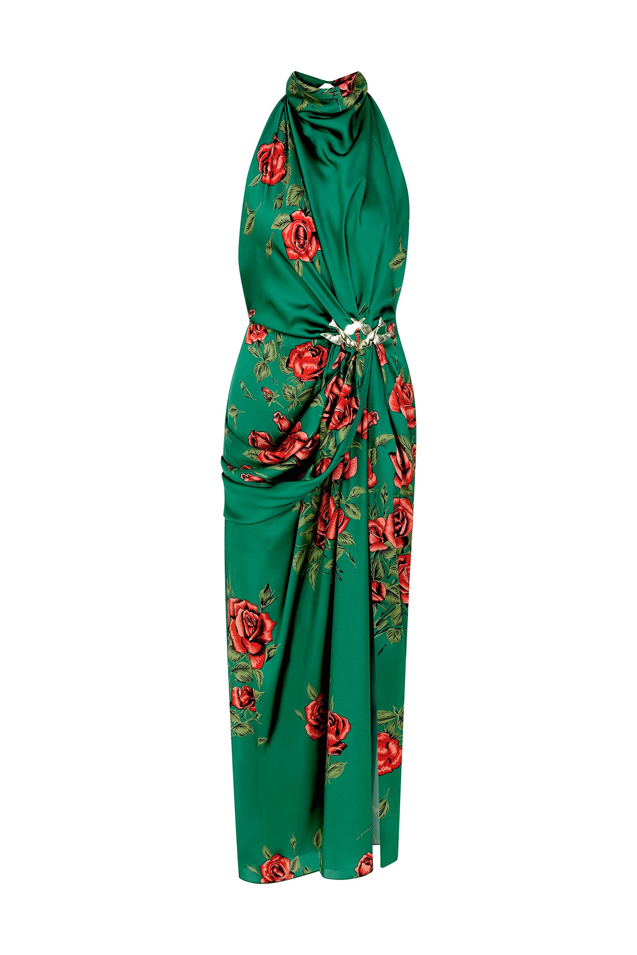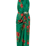 Rose Patterned Halter Neck Draped Midi Dress