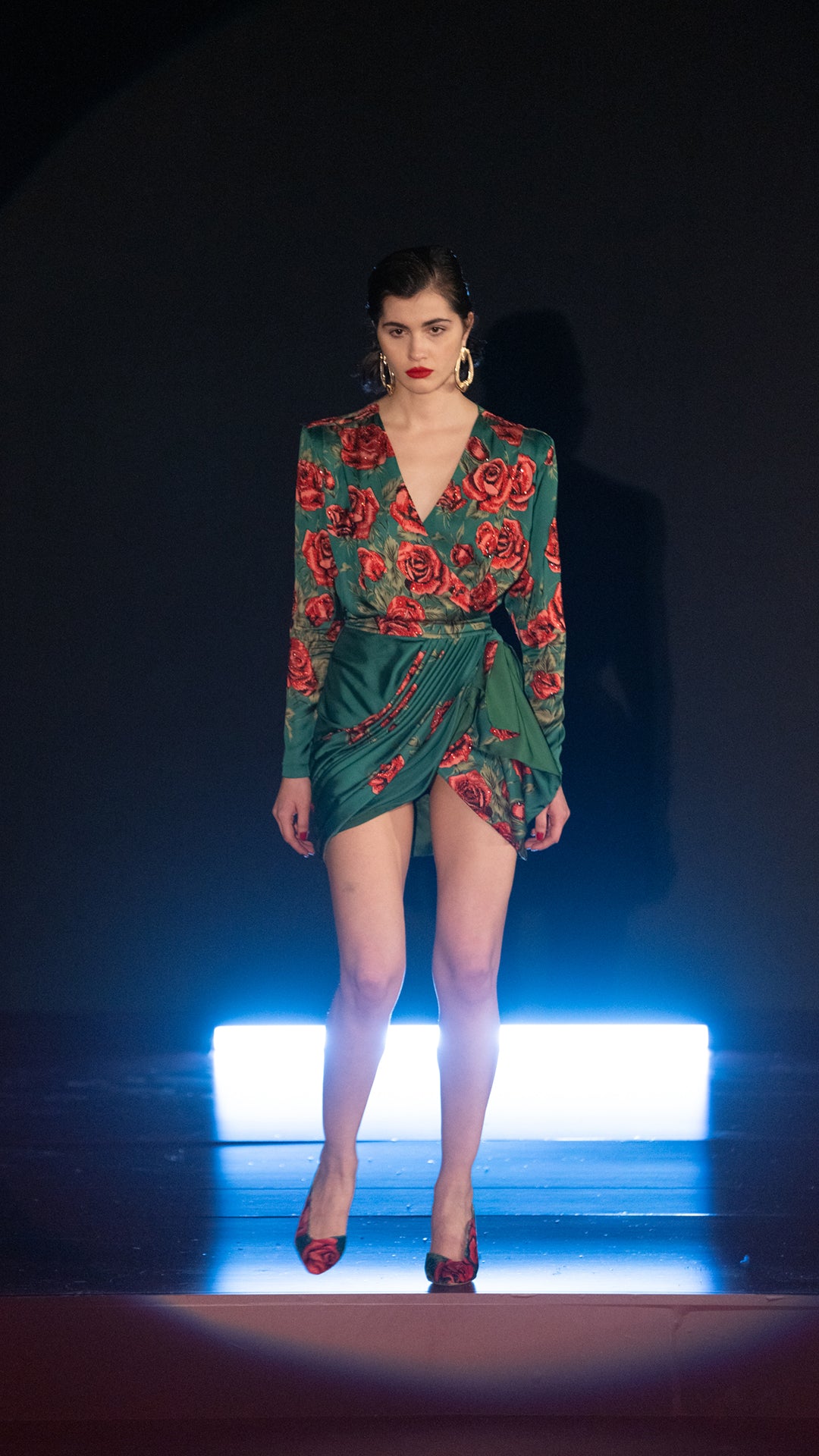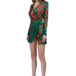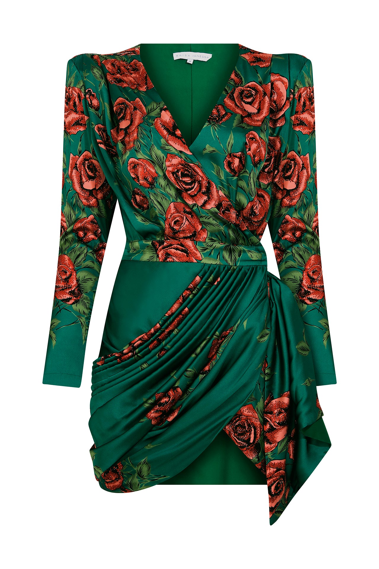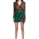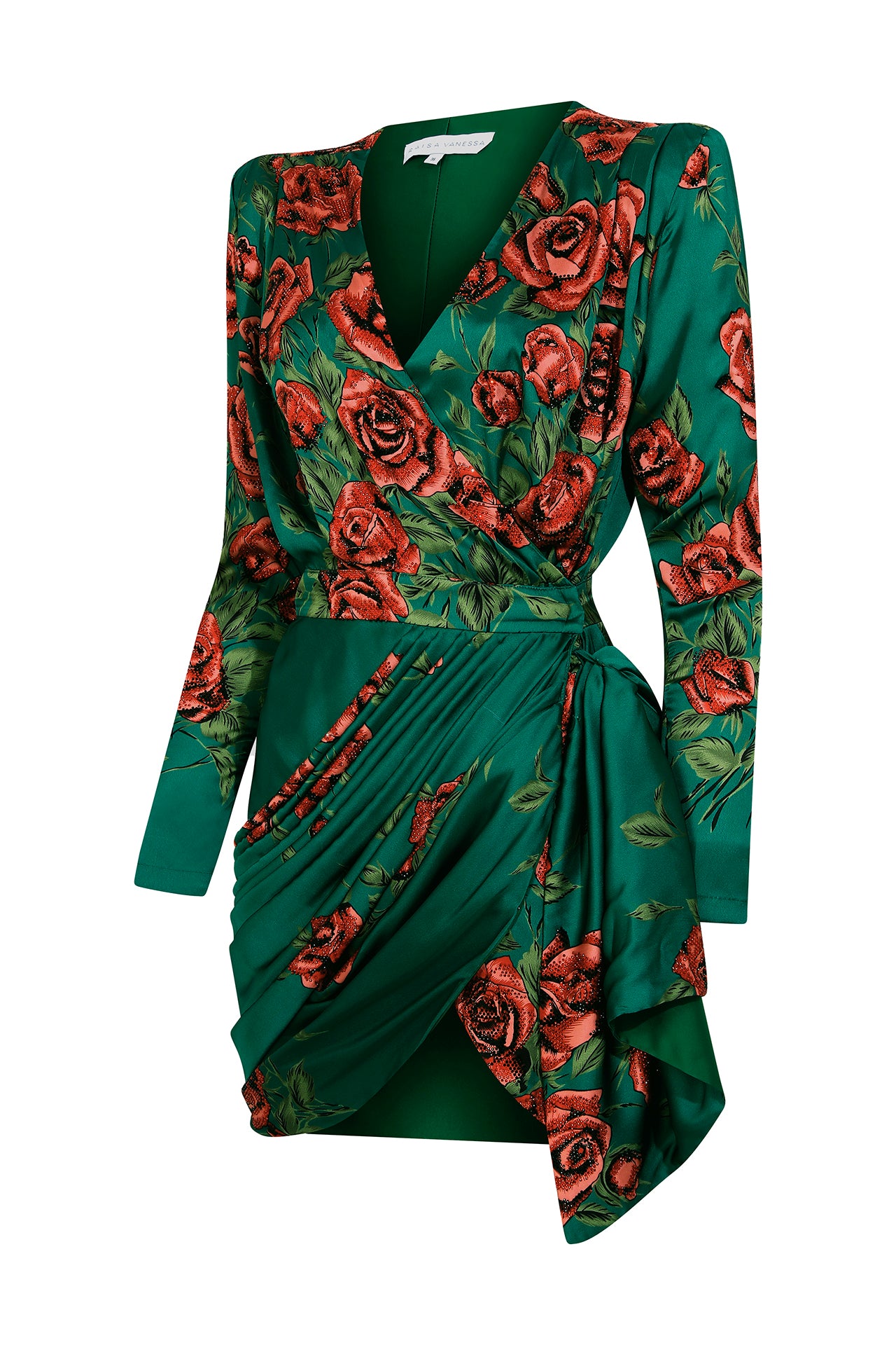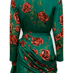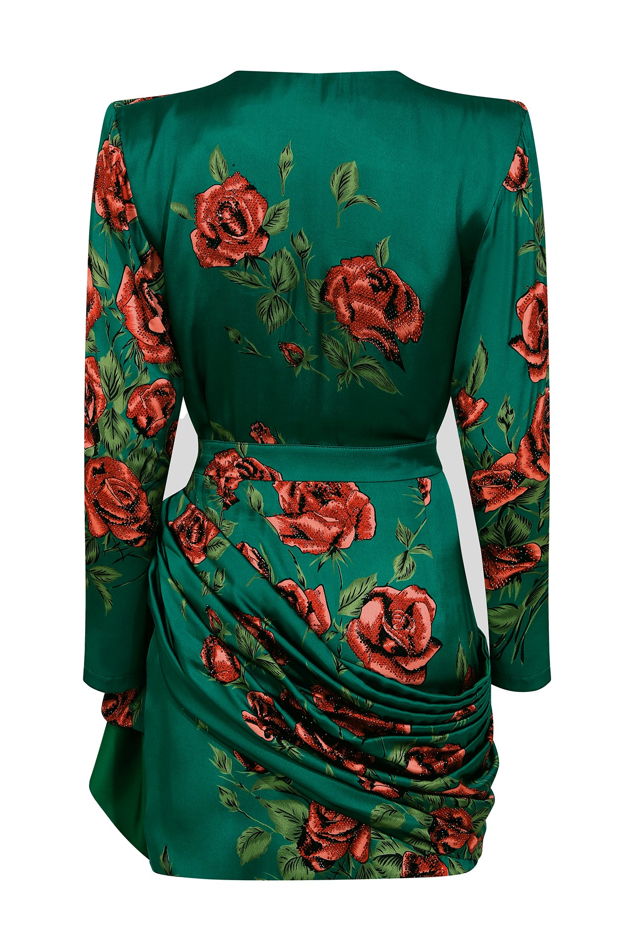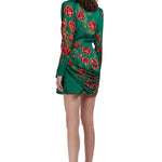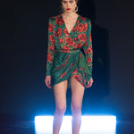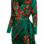 Rose Sequined Patterned Satin V Neck Draped Mini Dress