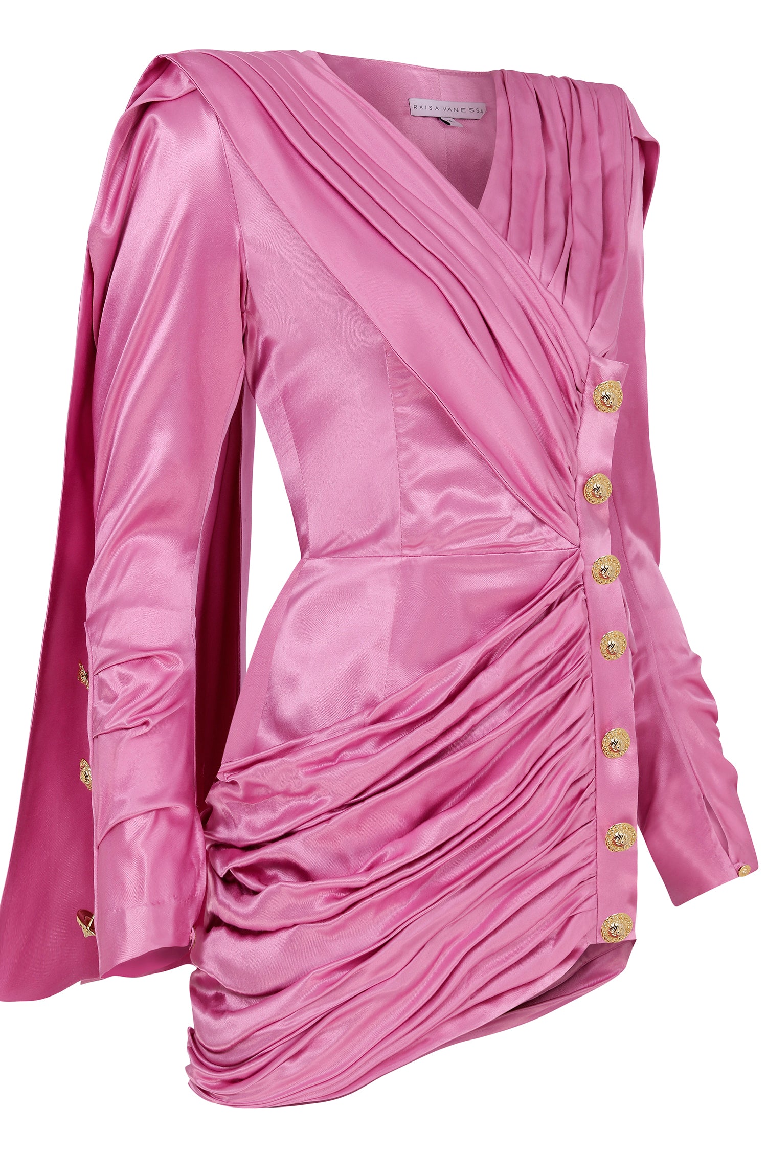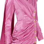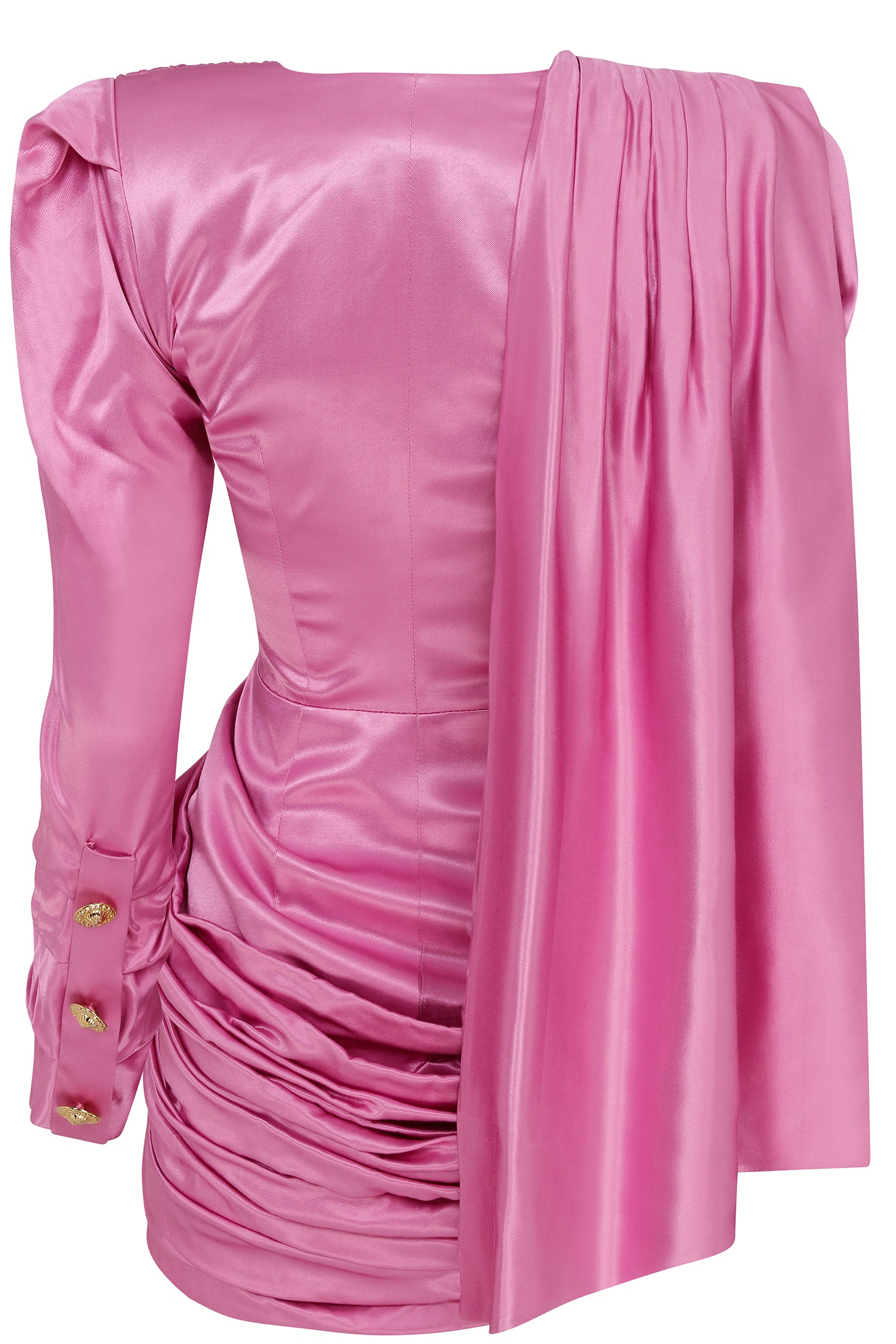 This gorgeous mini dress features draping at the hem and neckline, and has a sash hanging off the shoulder.