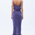 The sequined net maxi skirt features delicate handmade silk fringes, adding dynamic texture and a touch of glamour. Its flowing silhouette and intricate design make it a stunning choice for a sophisticated and bold look.