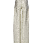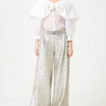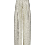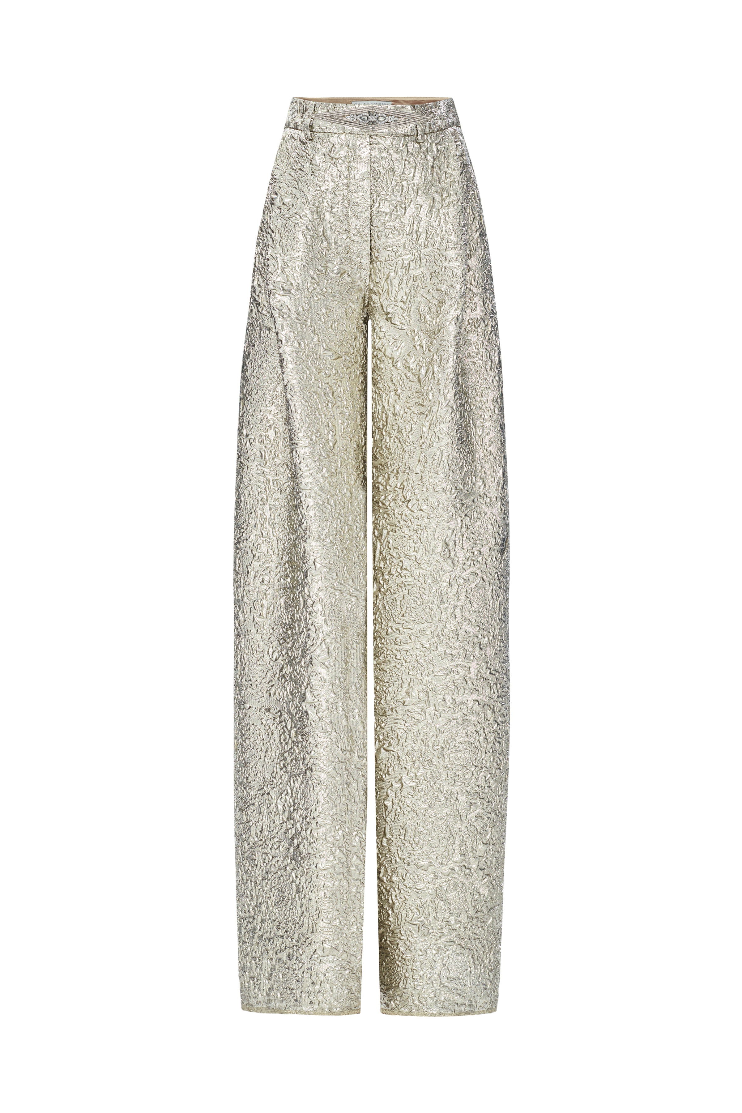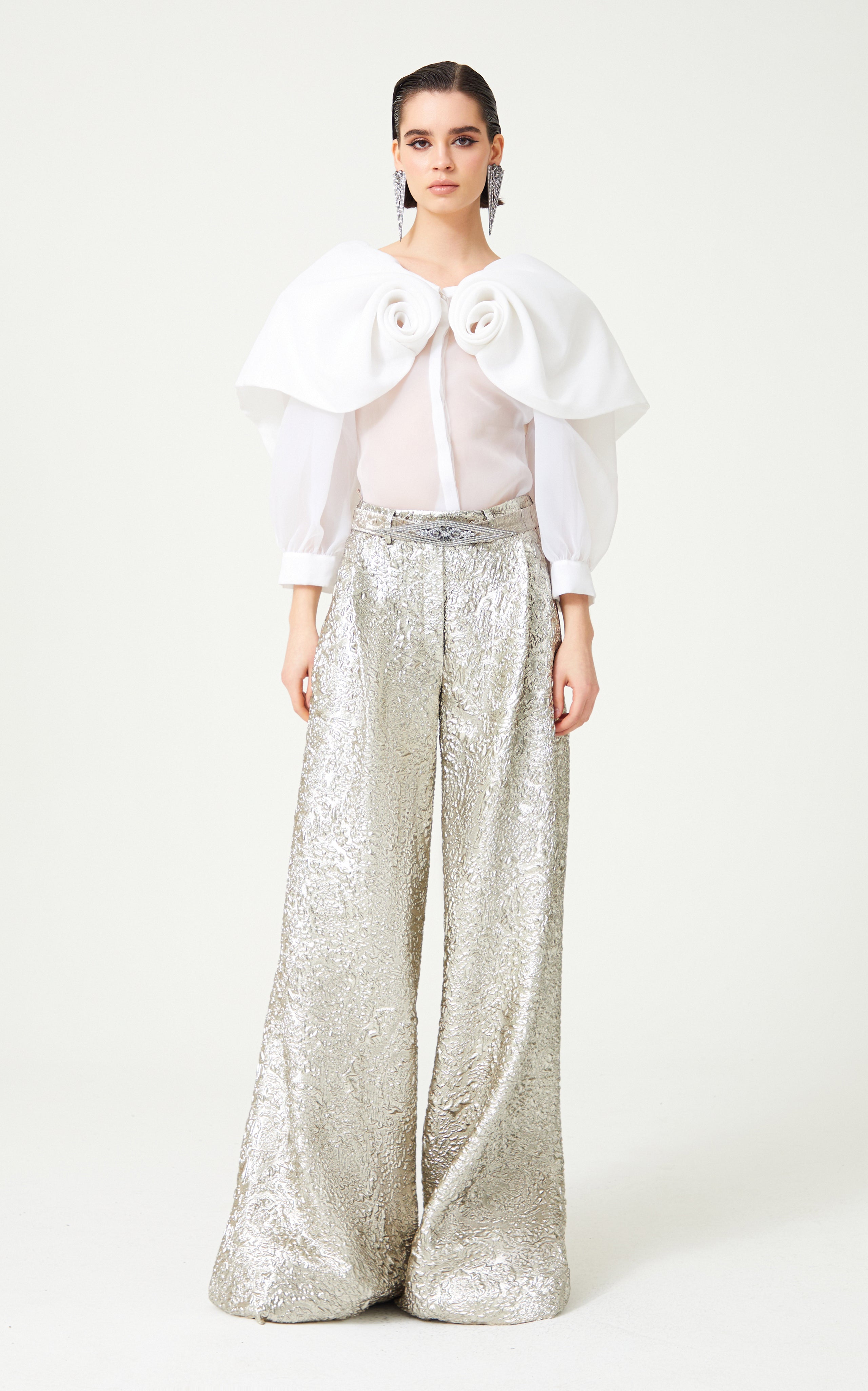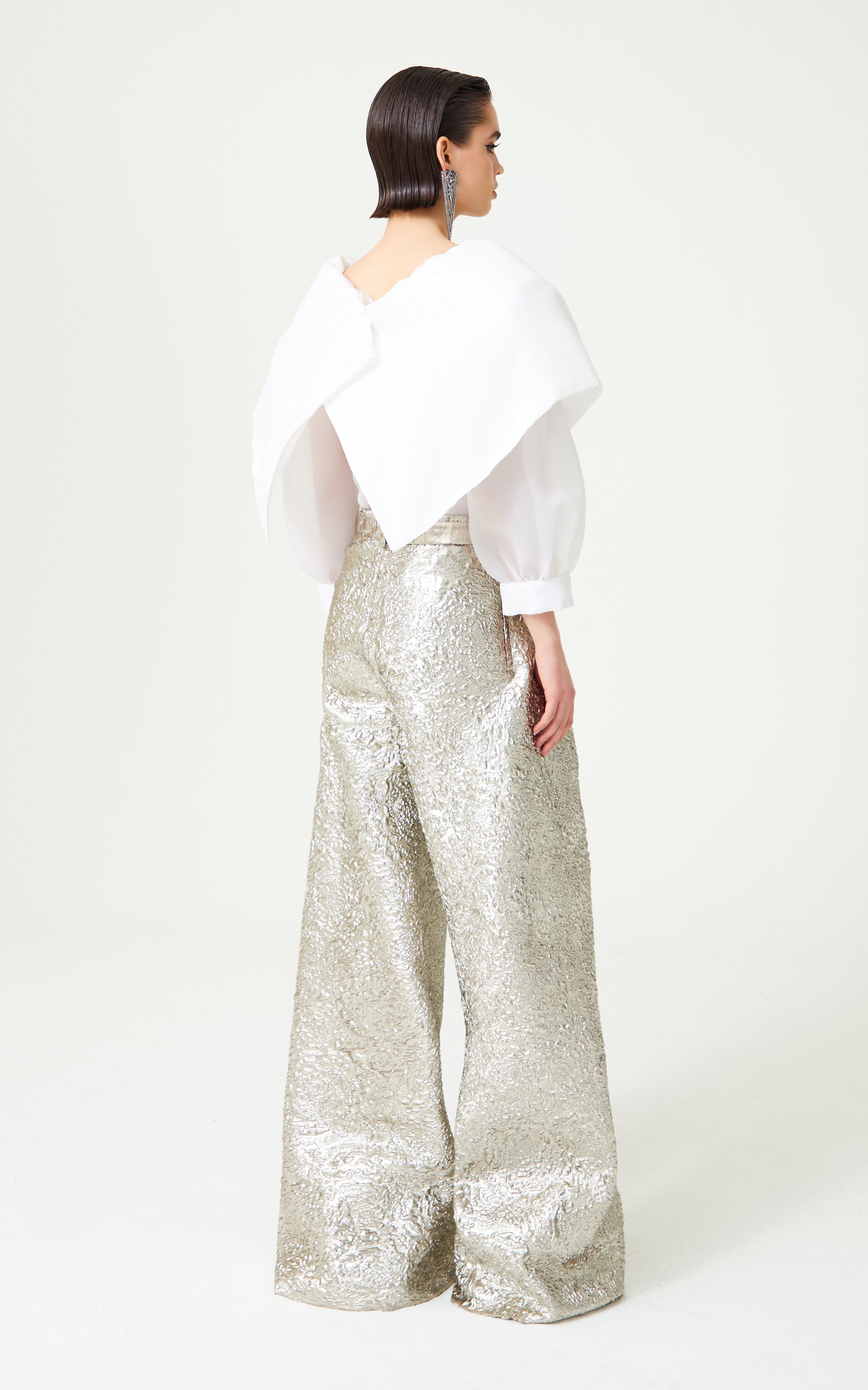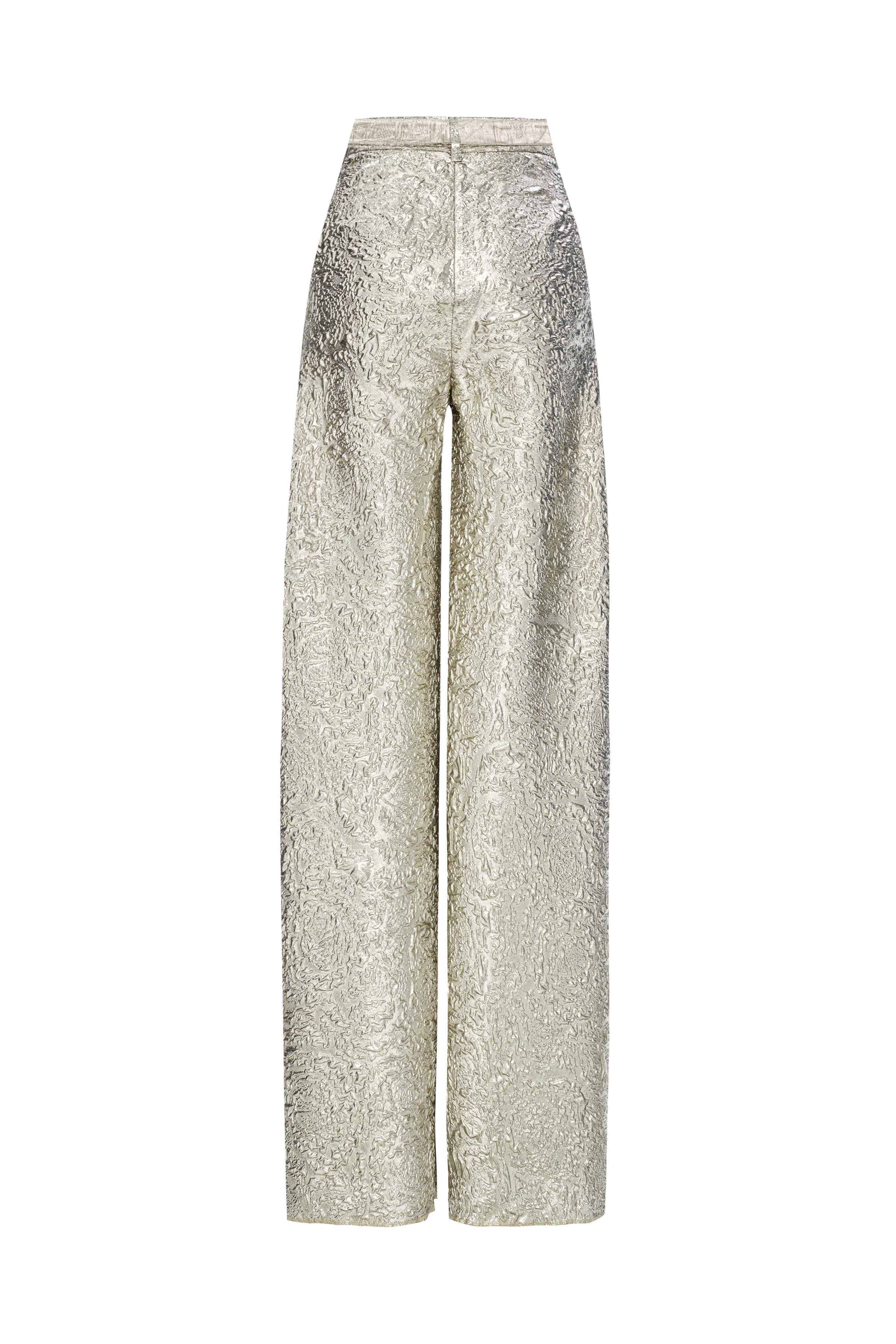 Make a statement with these Silver Jacquard Wide Leg Pleated Pants, combining sophistication with a touch of flair for a polished and stylish ensemble.