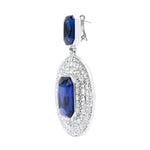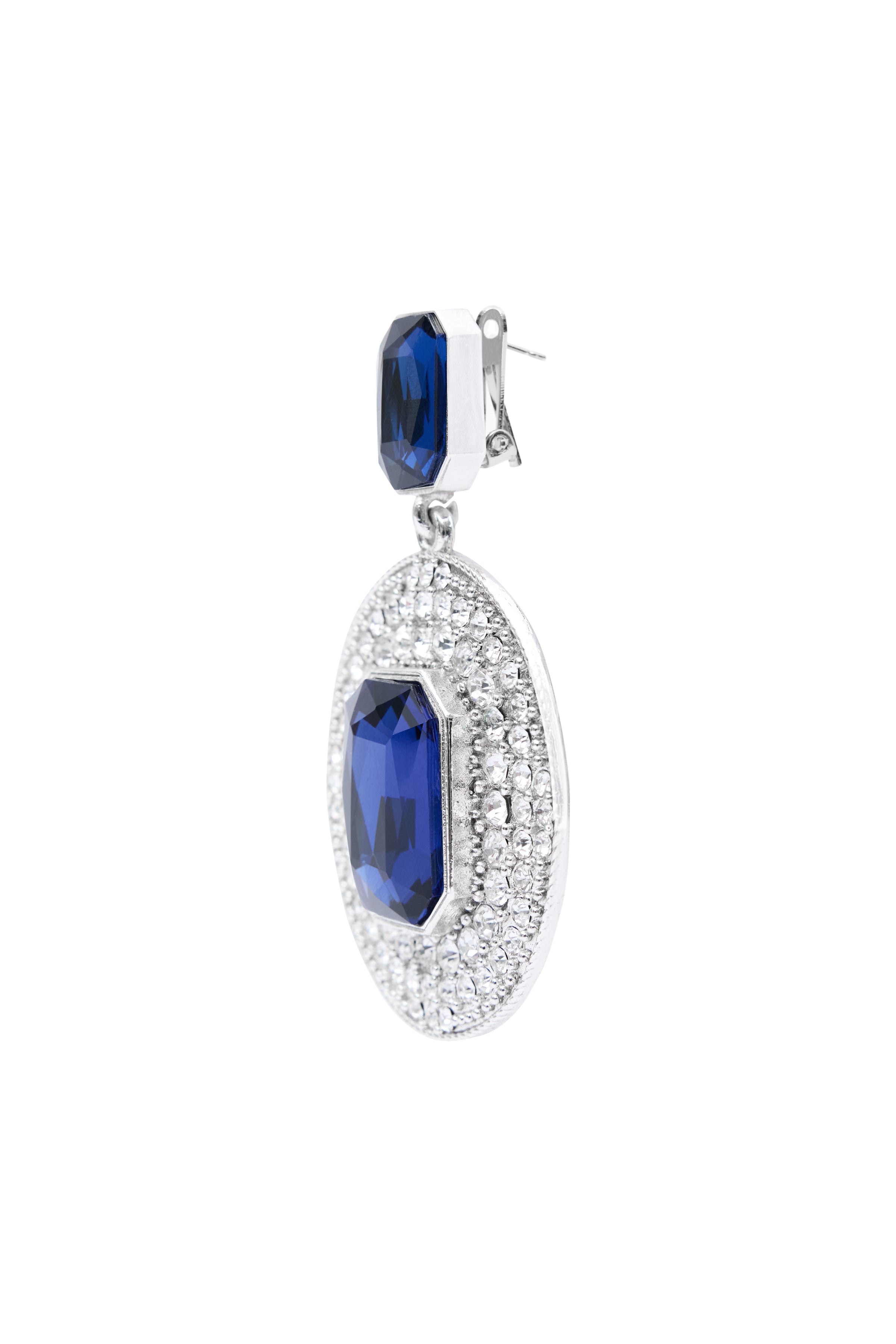 These silver metal earrings are adorned with sparkling crystals and deep sapphire stones, offering a cool-toned elegance with a touch of drama.
