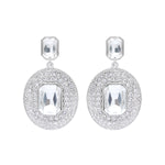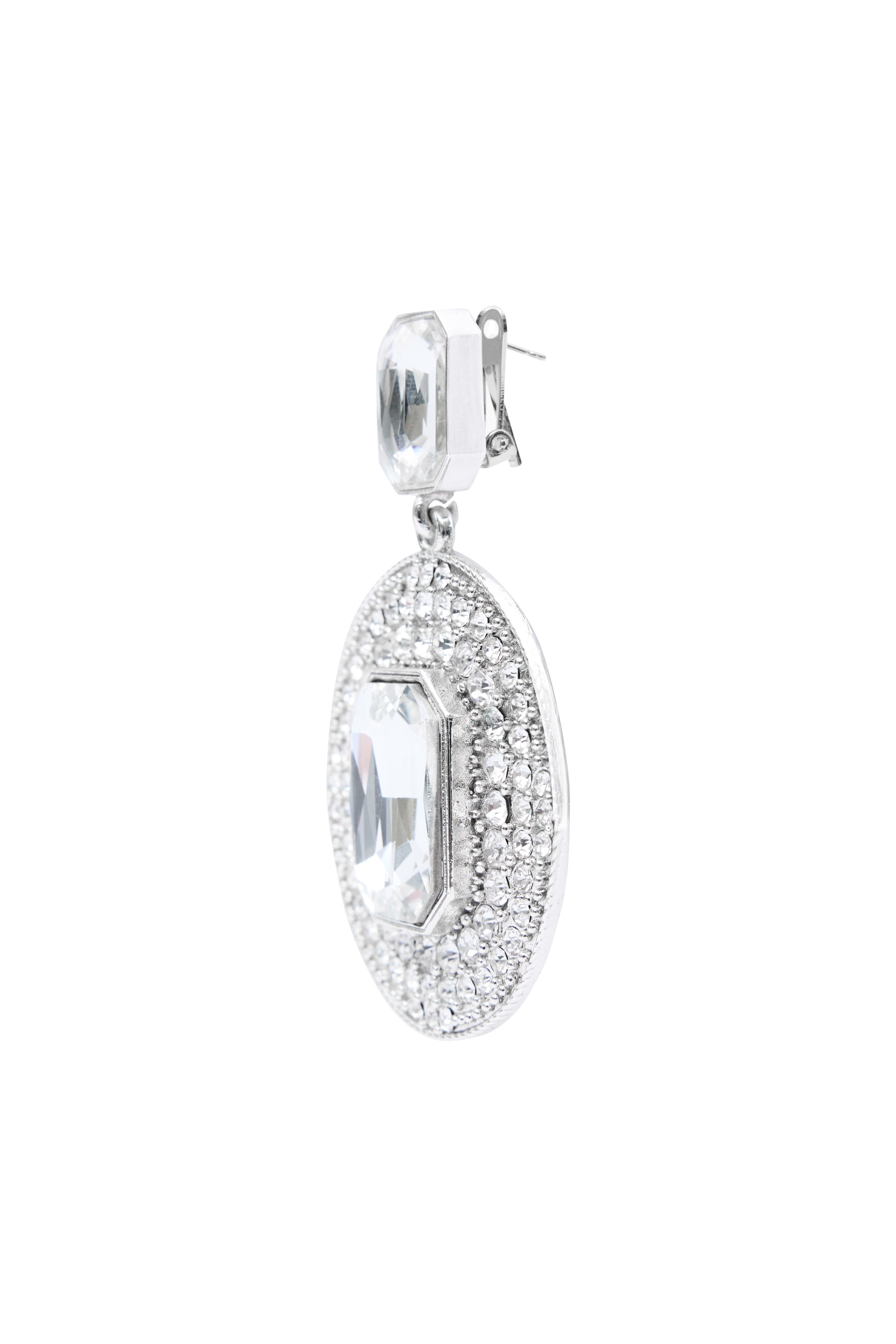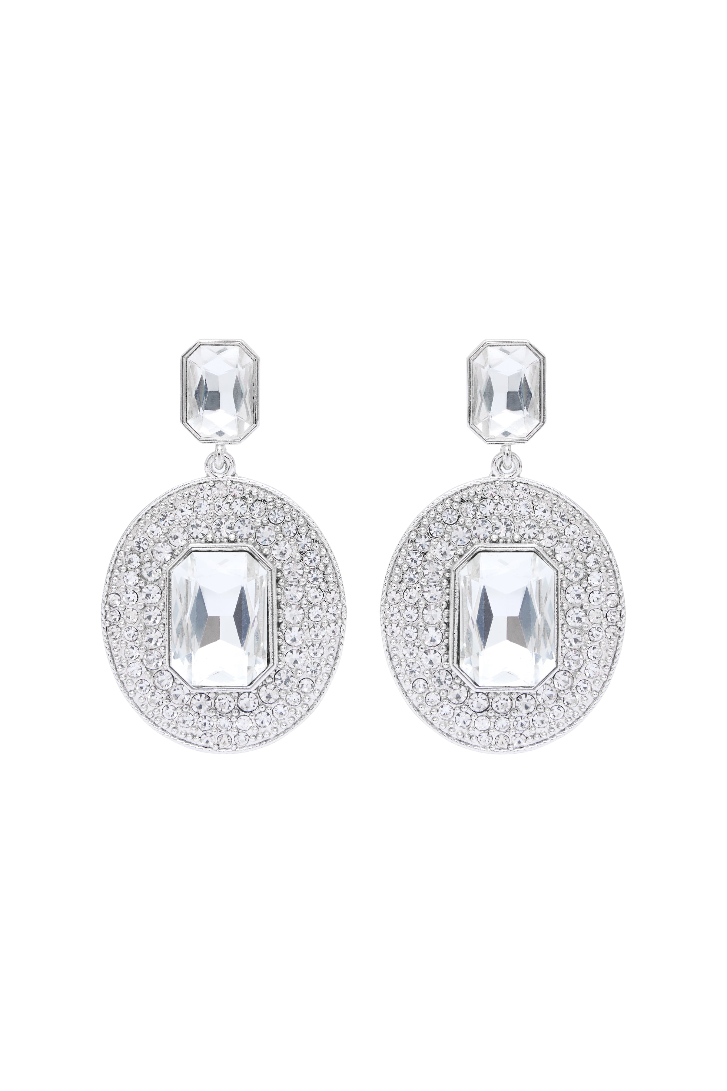 These silver metal earrings are embellished with dazzling crystals and tonal silver stones, capturing light with every movement. A luminous accent for bold evening looks.