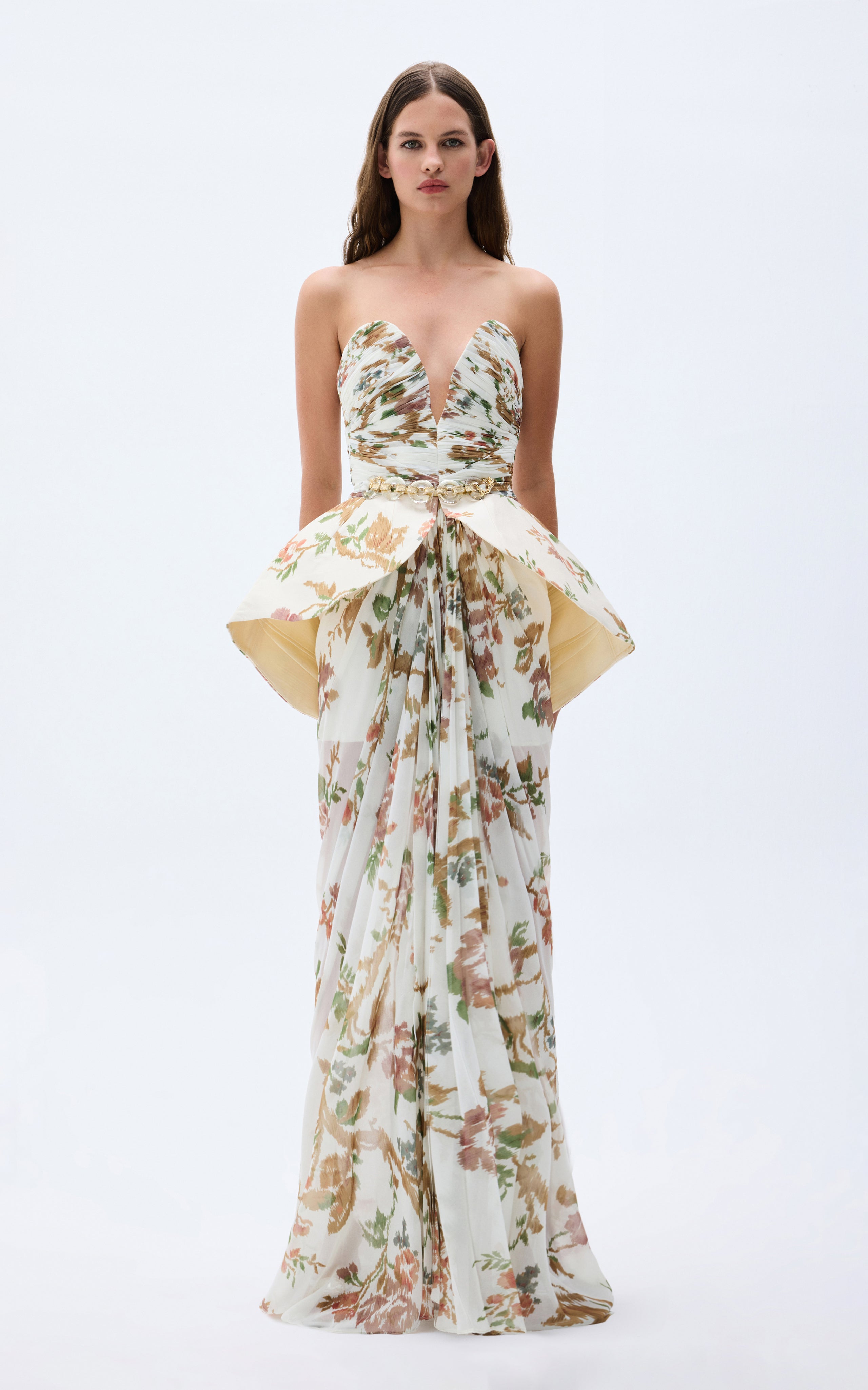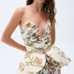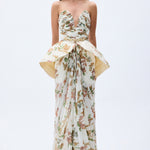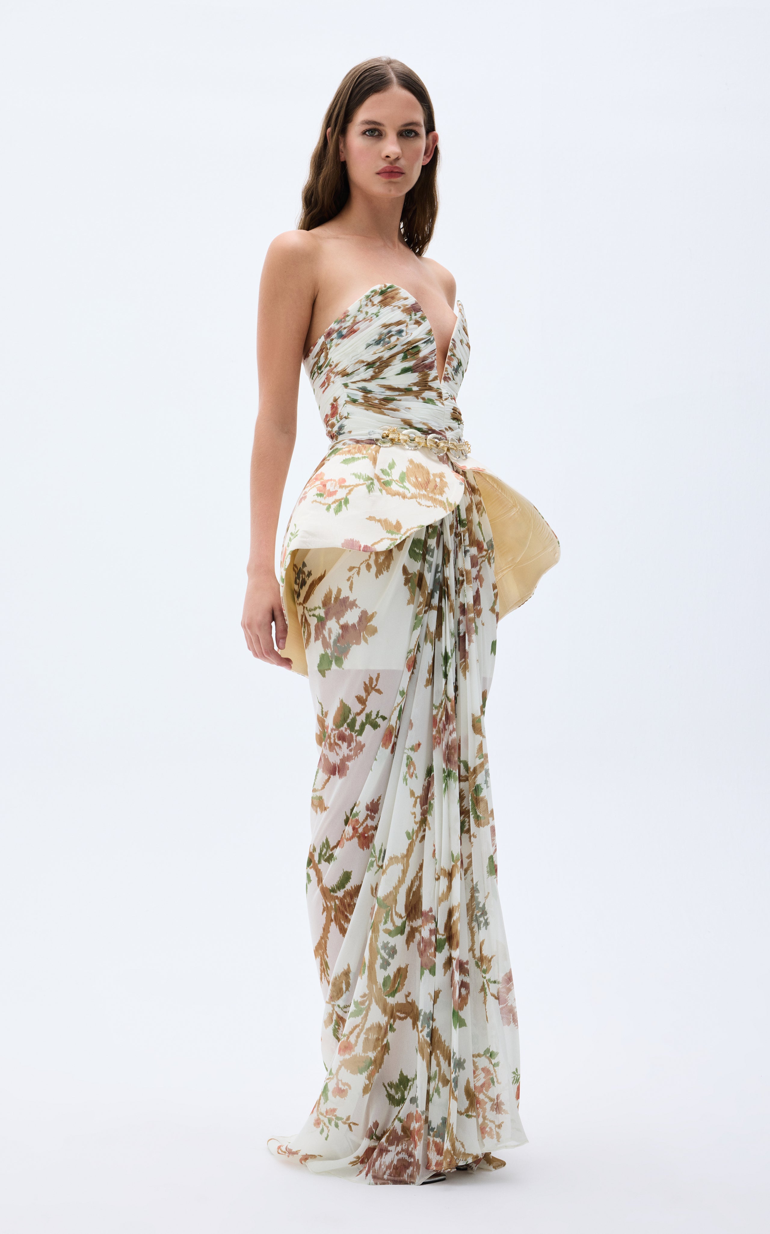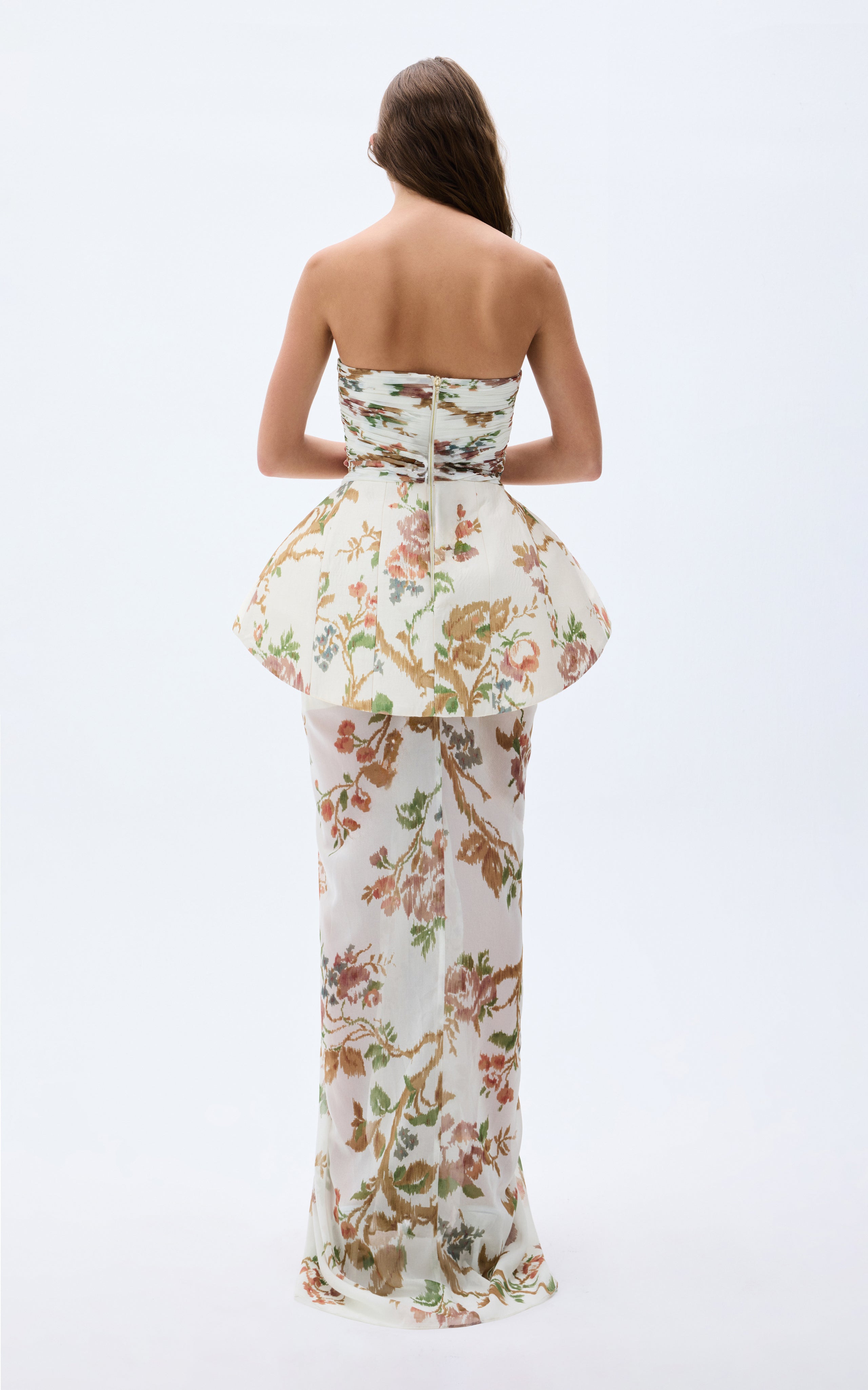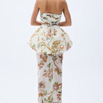 Strapless Flower Printed Corseted Maxi Dress With Sculptural Waist Detail