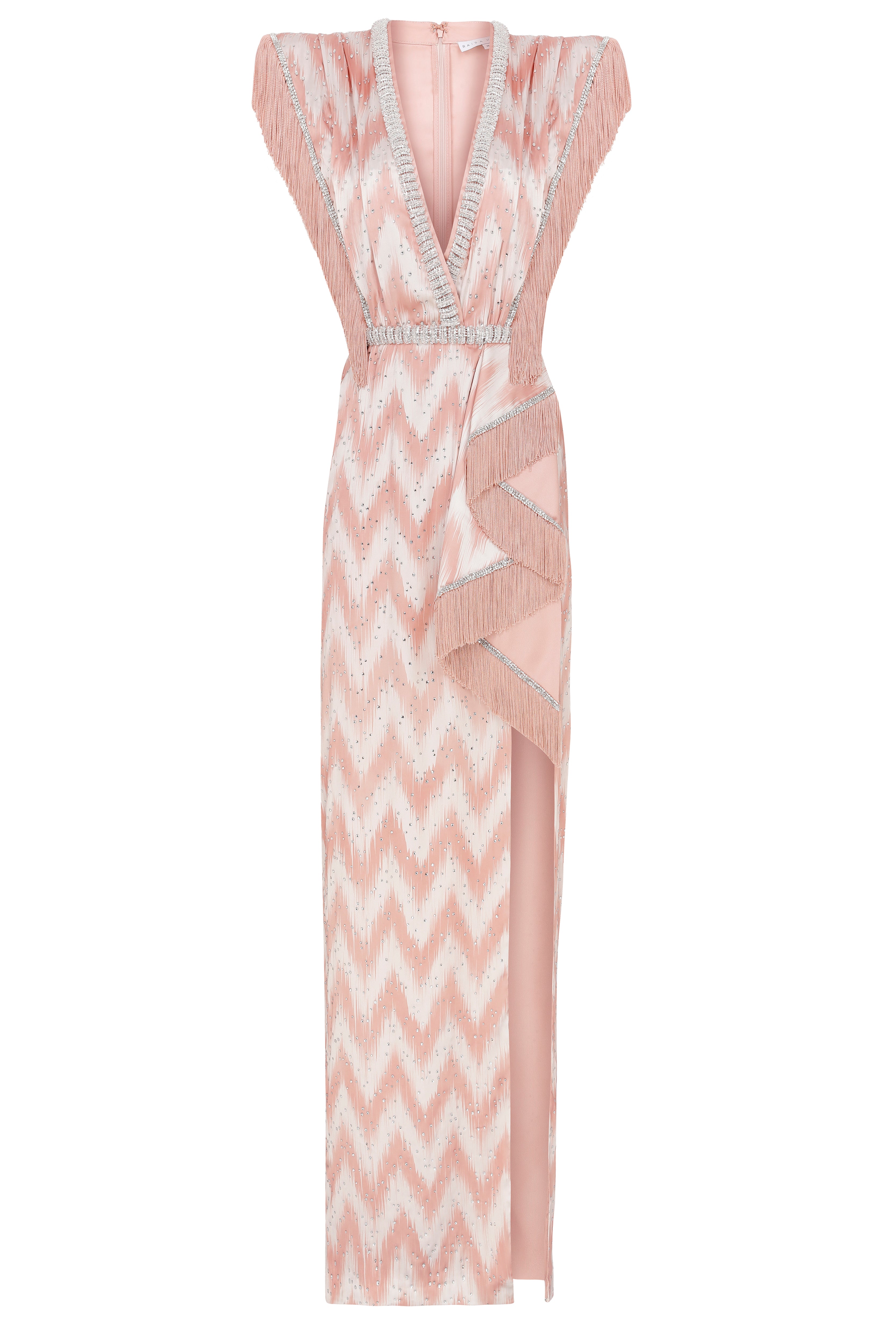Strass Embellished Zİgzag Patterned V-Neck Maxi Dress with Fringe Detail on Slit