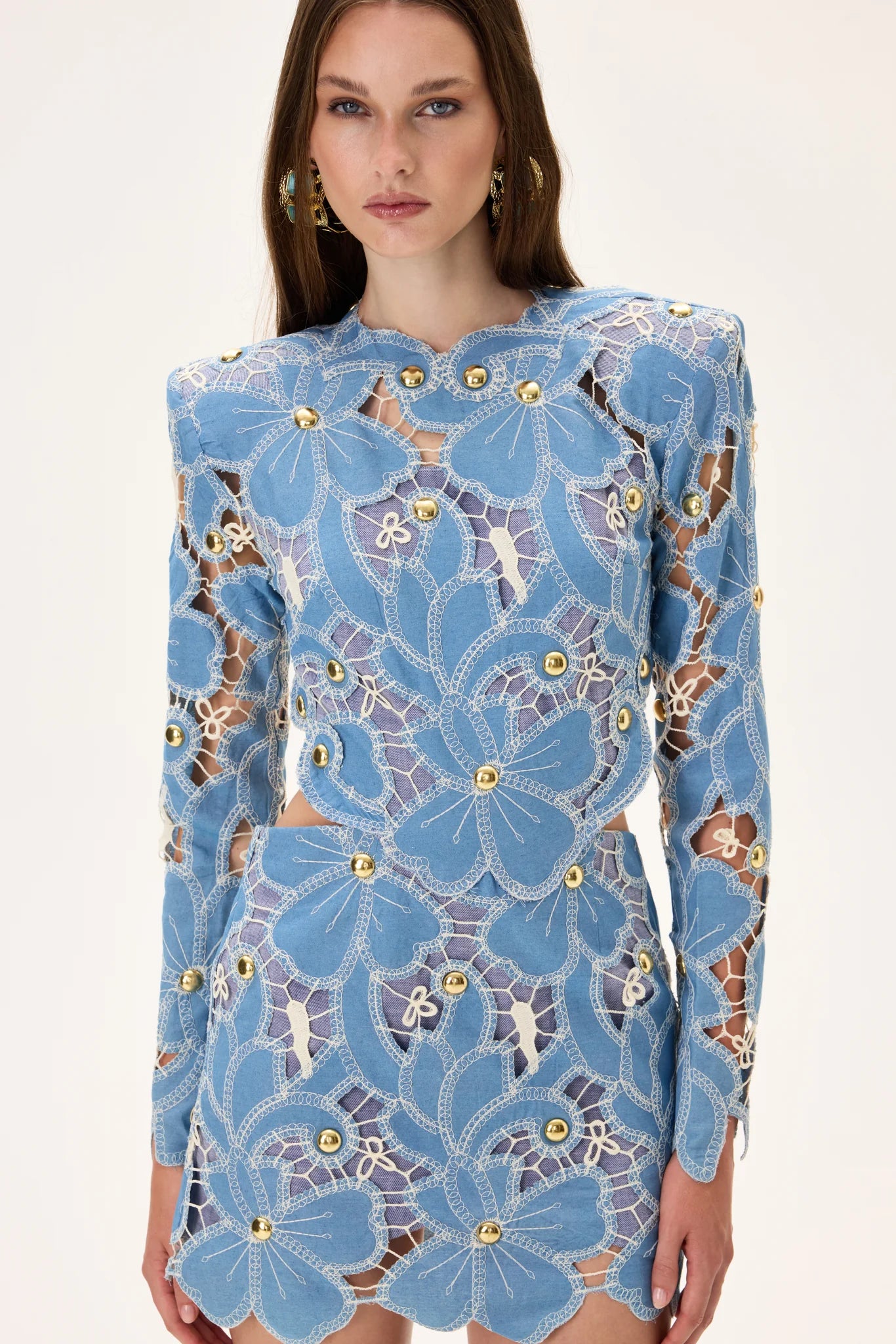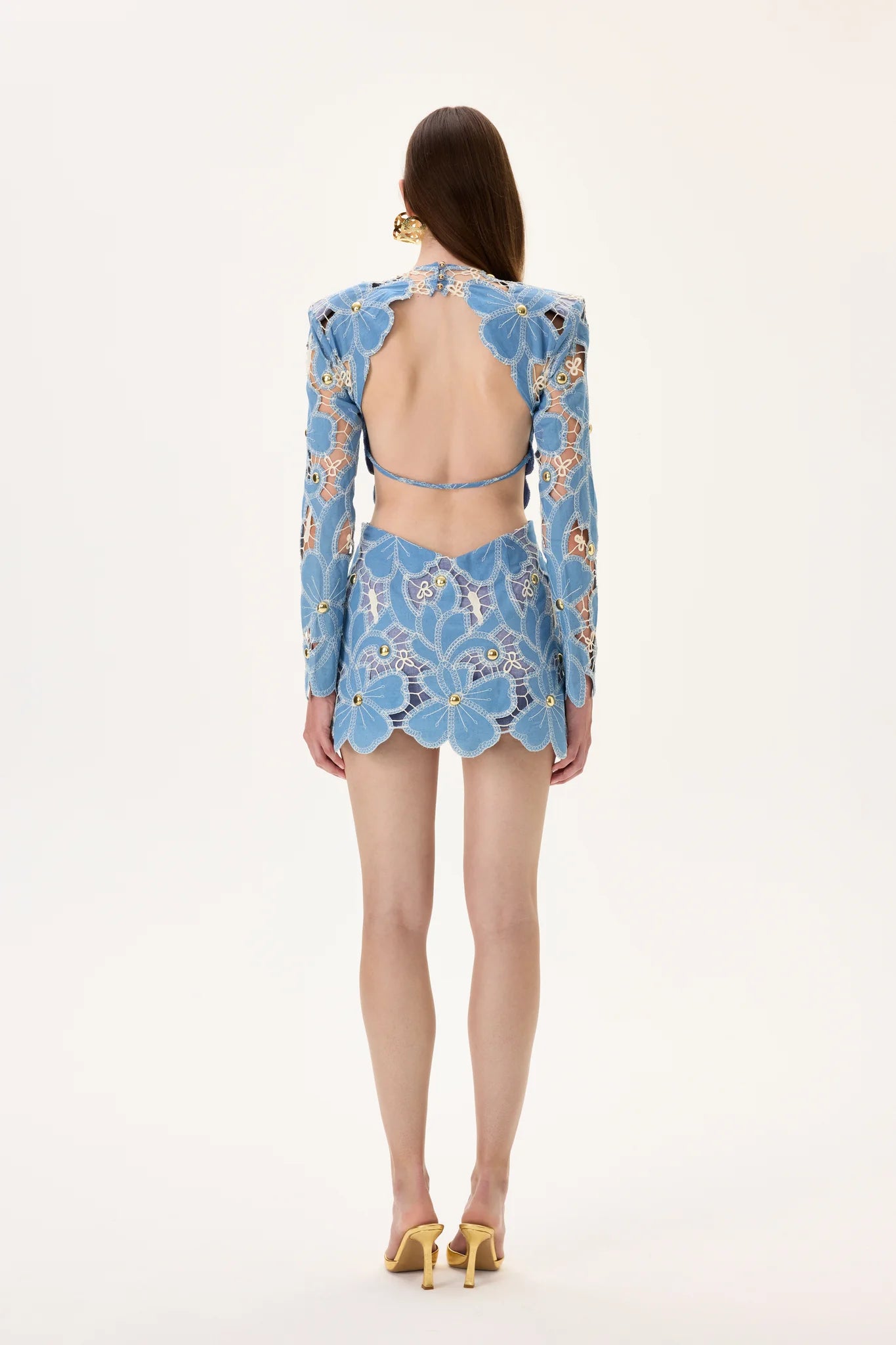 Denim & Lace Mini Dress With Gold Metal Centered Flower Embroidery