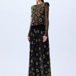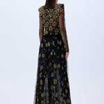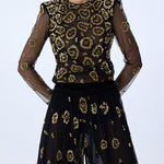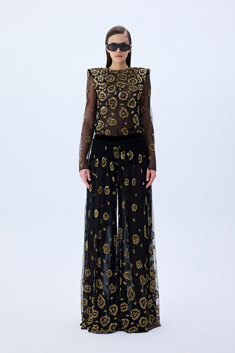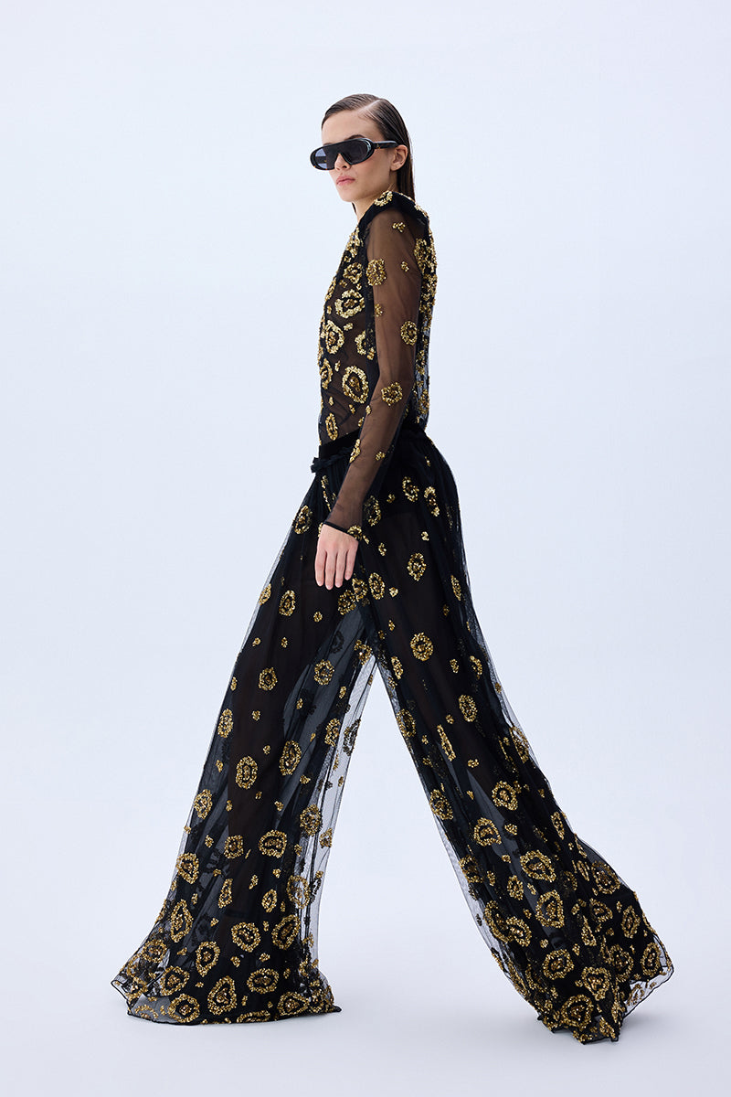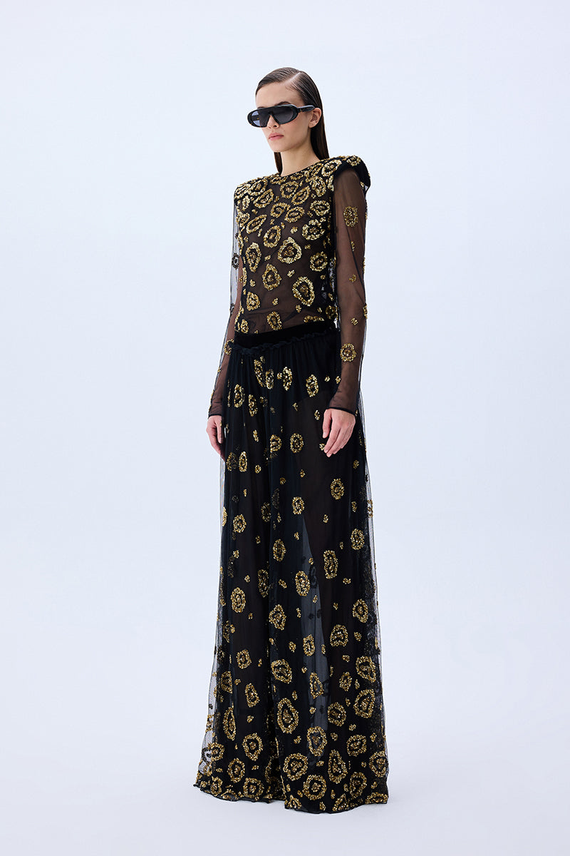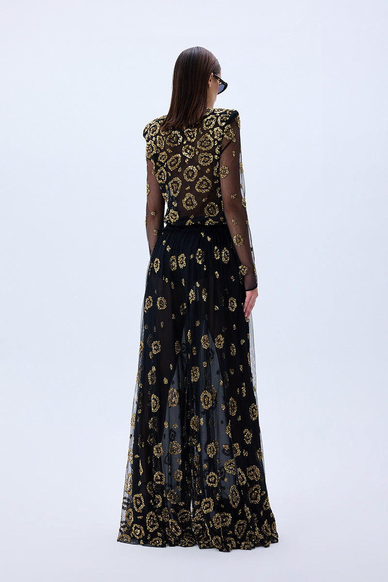 A sheer expression of bold elegance. The transparent tulle top is embroidered with golden leopard sequins, blending sensuality and strength in a powerful silhouette.