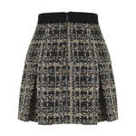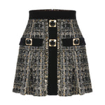 This pleated skirt is made of tweed fabric and decorated with gold accessories.