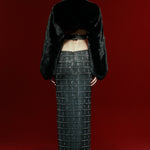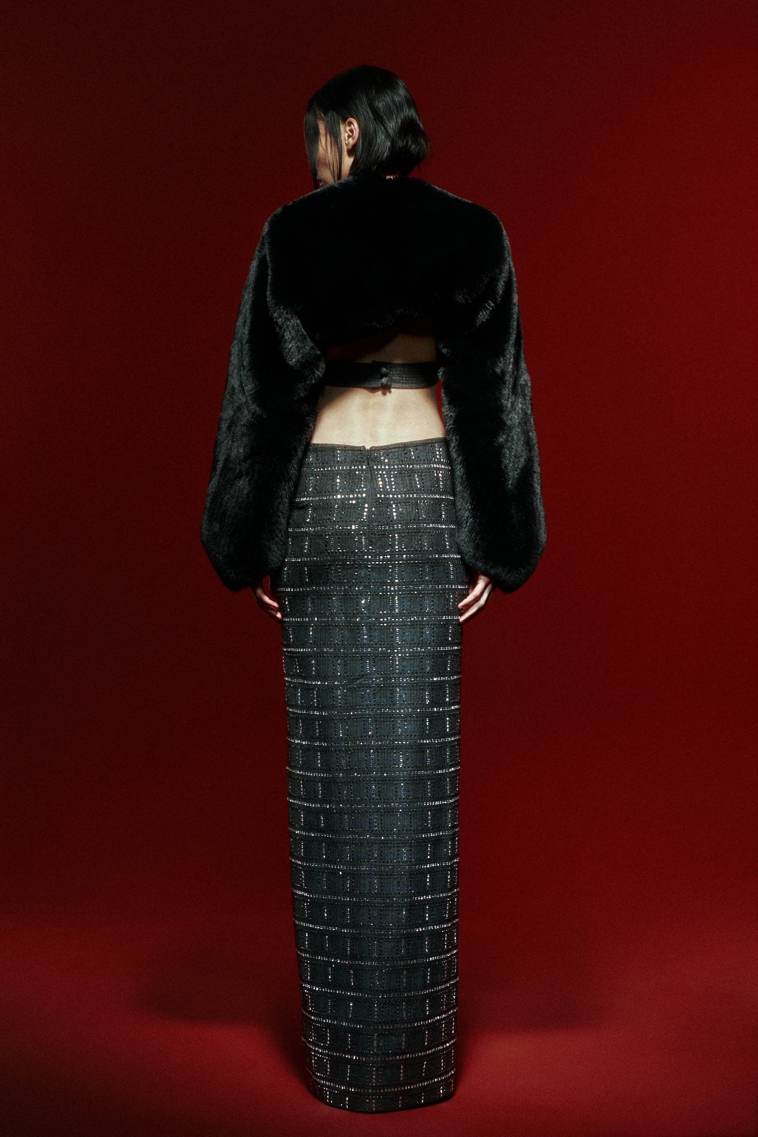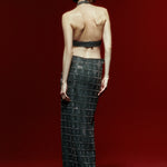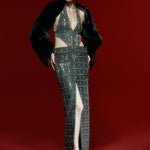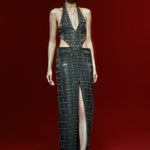 V-Neck Grey Side Open Maxi Dress with Ecose Crystal Stone and High Slit Detail
