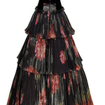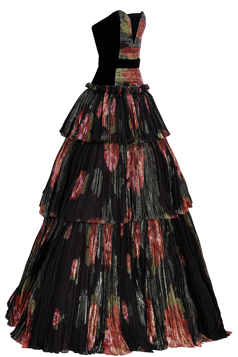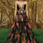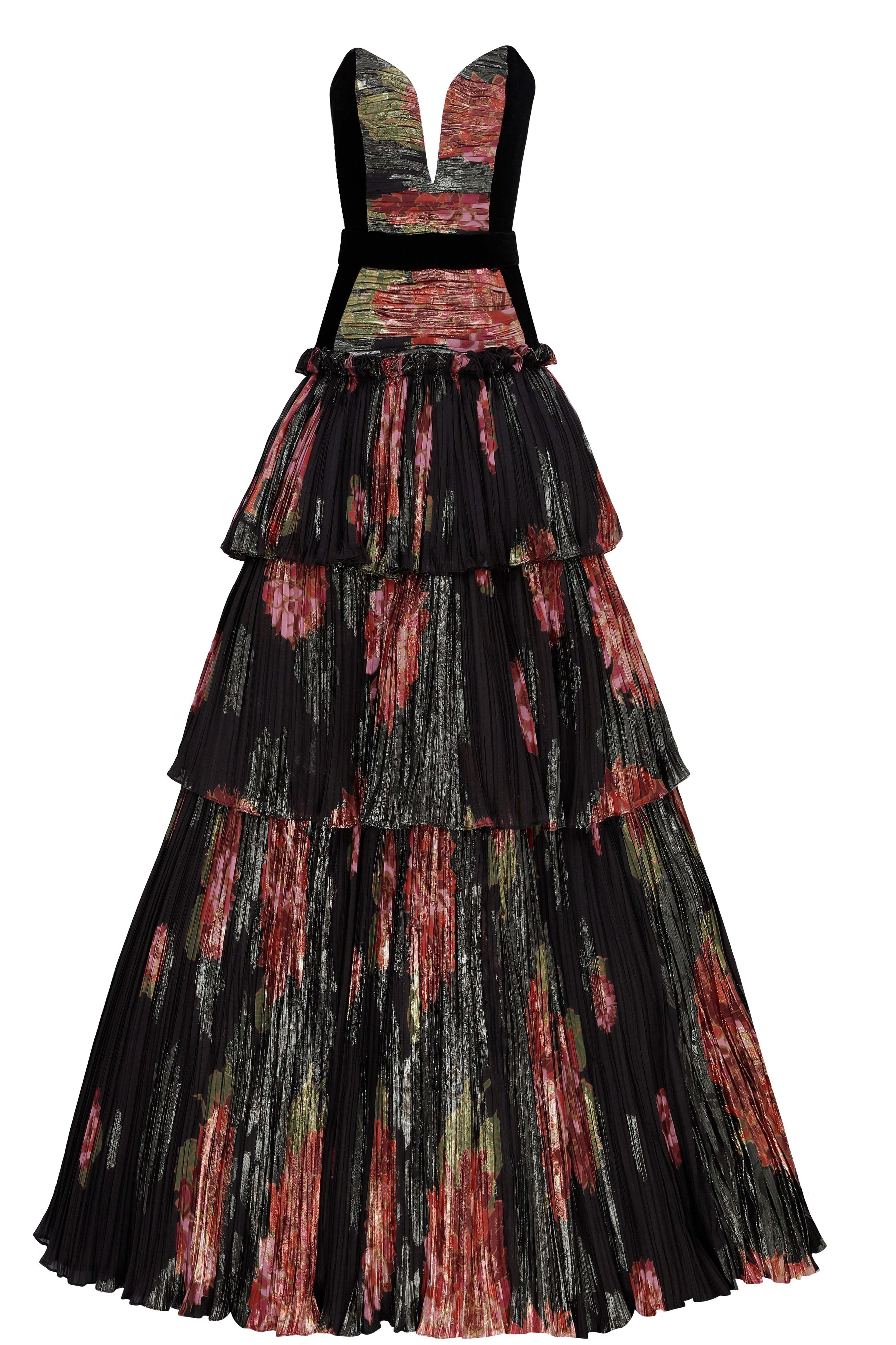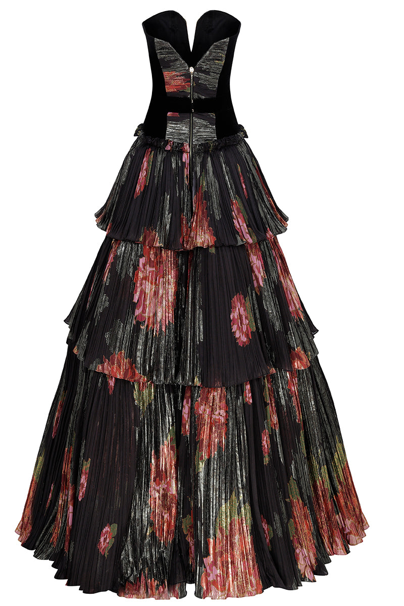 Velvet and Floral Printed Strapless Layered Maxi Dress