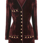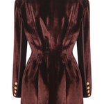 Velvet jacket decorated with gold buttons and wrapped around the waist.