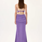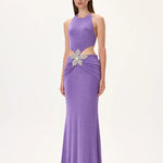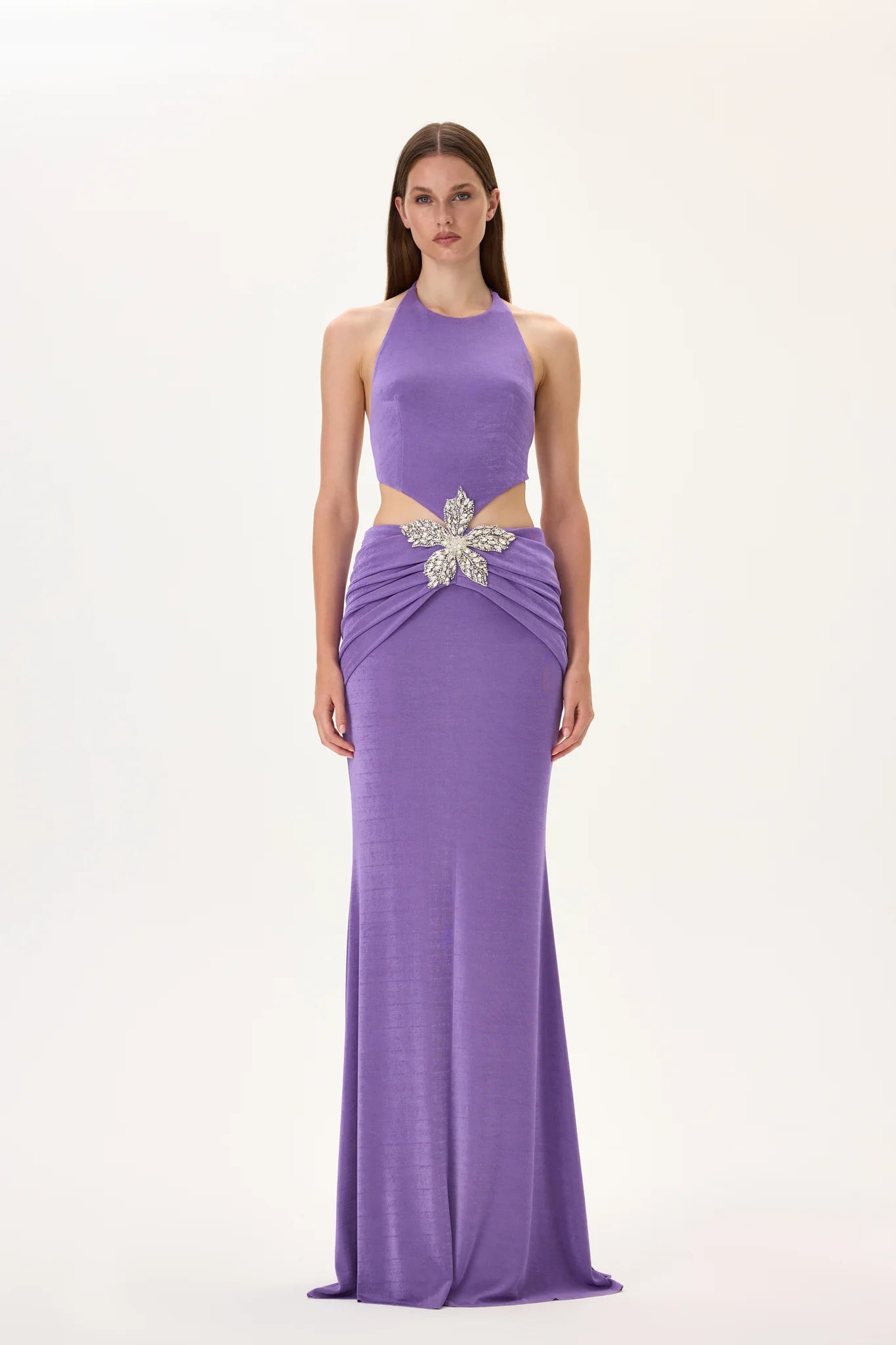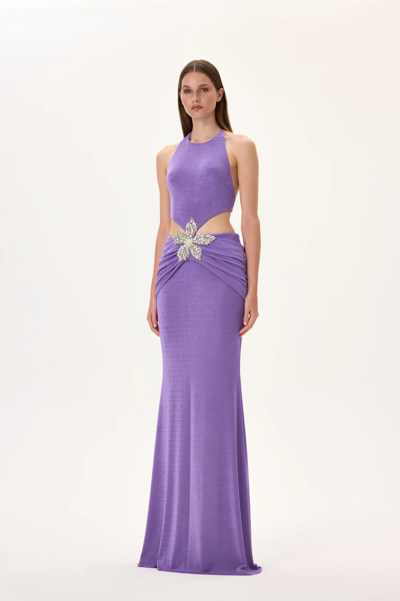 Stunning violet buzzy maxi gown designed with a draped waistline and crystal flower embellishment. A luxurious statement piece crafted for evening elegance and refined style.