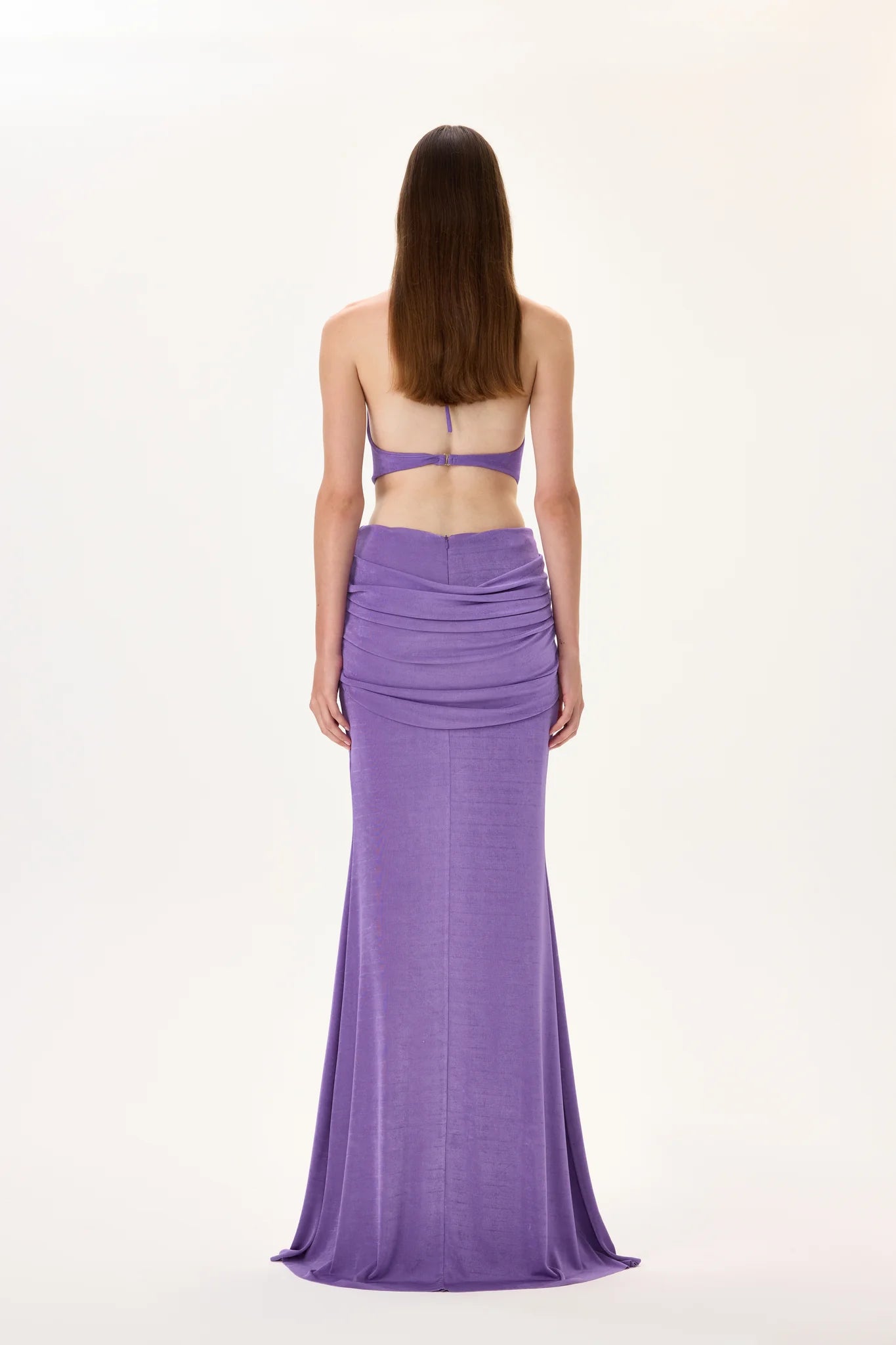 Violet Buzzy Maxi Gown With Draped Waistline And Crystal Flower