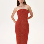 Vivid Pomegranate Pearl Corseted Strapless Gown