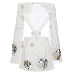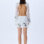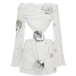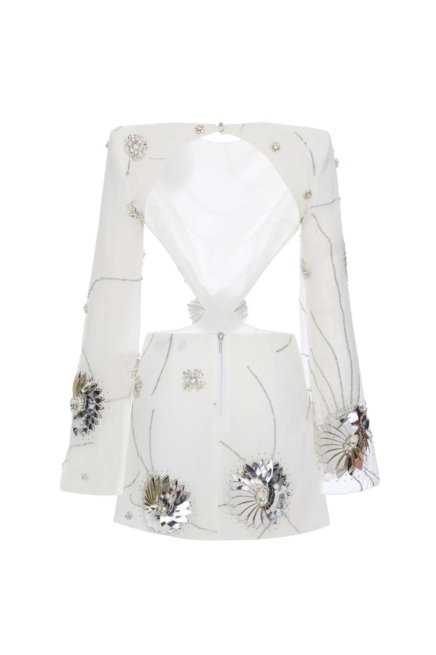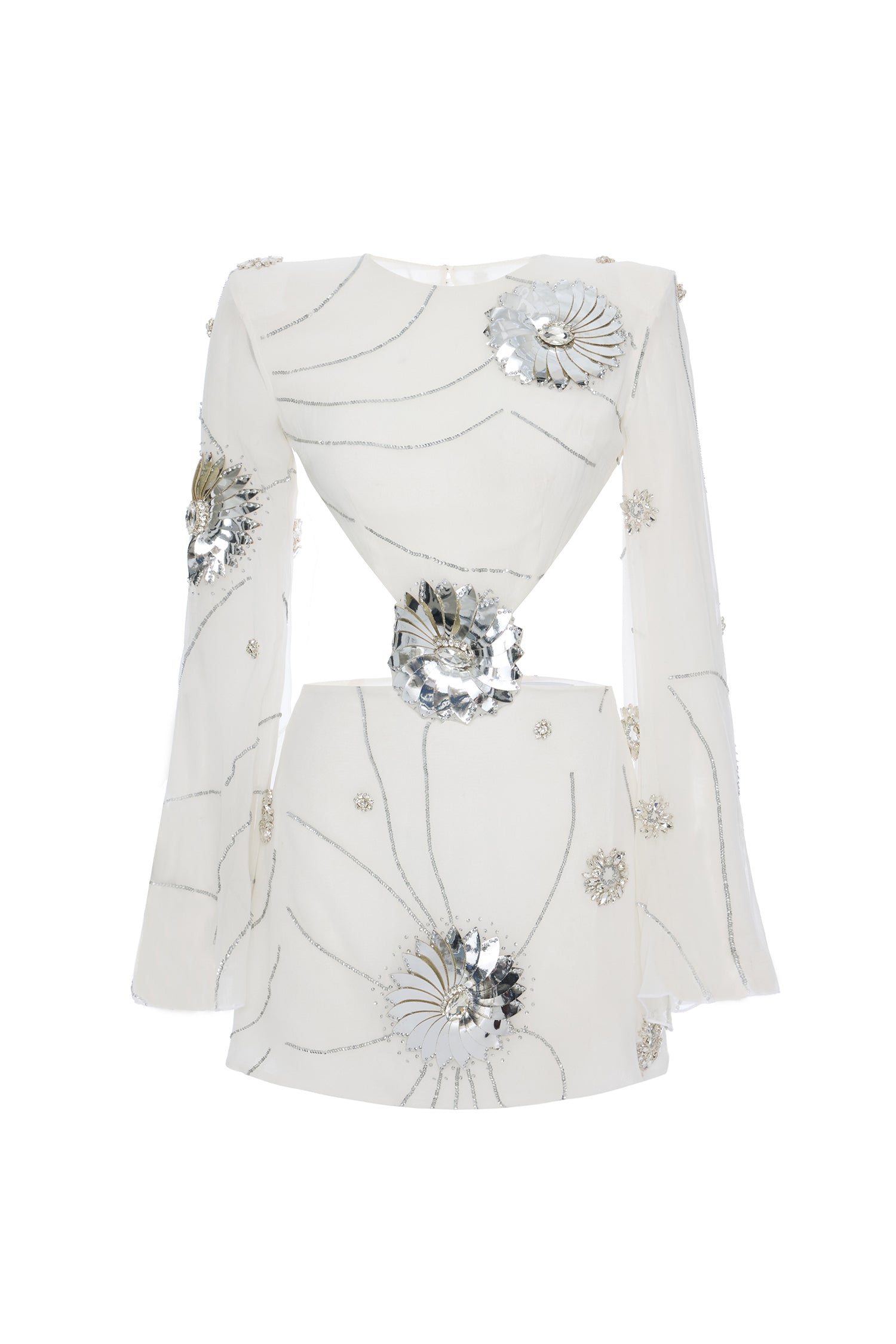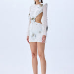 A captivating silhouette defined by architectural cutouts and intricate craftsmanship. This white mini dress is tailored from delicate chiffon and fully adorned with iridescent sequins, offering a fluid shimmer with every step. Sculptural patent flower appliqués add a dimensional contrast, while the open back and asymmetric structure lend a contemporary allure to this statement piece.