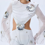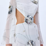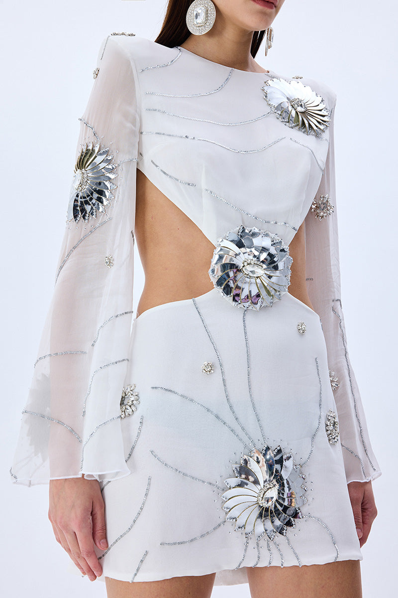 White Sequined Chiffon Cutout Mini Dress With Patent Flowers